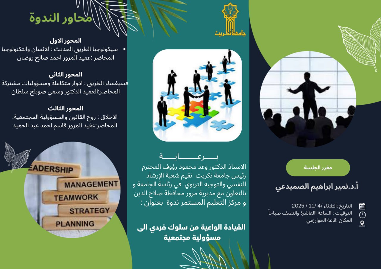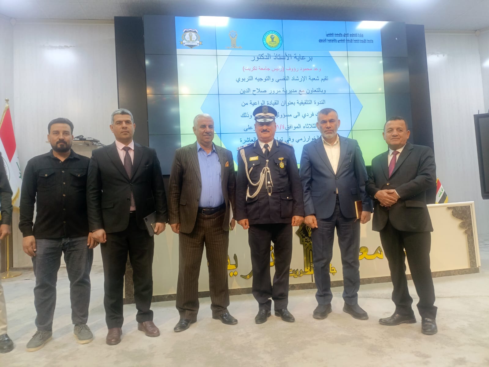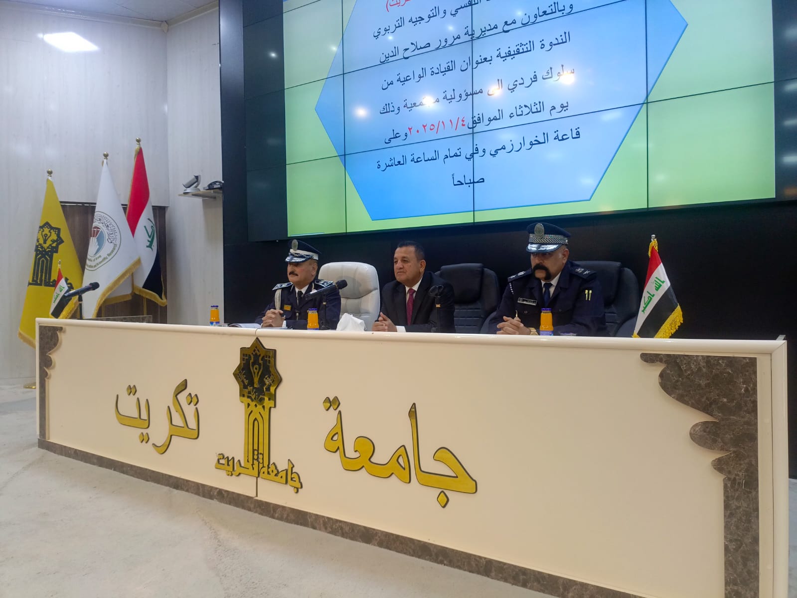 برعاية الأستاذ الدكتور وعد محمود رؤوف رئيس جامعة تكريت تقيم شعبة الإرشاد النفسي والتوجيه التربوي اليوم الثلاثاء الموافق2025/11/4 وبالتعاون مع مديرية مرور محافظه صلاح الدين ندوه تثقيفية تحت عنوان القيادة الواعية من سلوك فردي إلى مسؤولية مجتمعية
