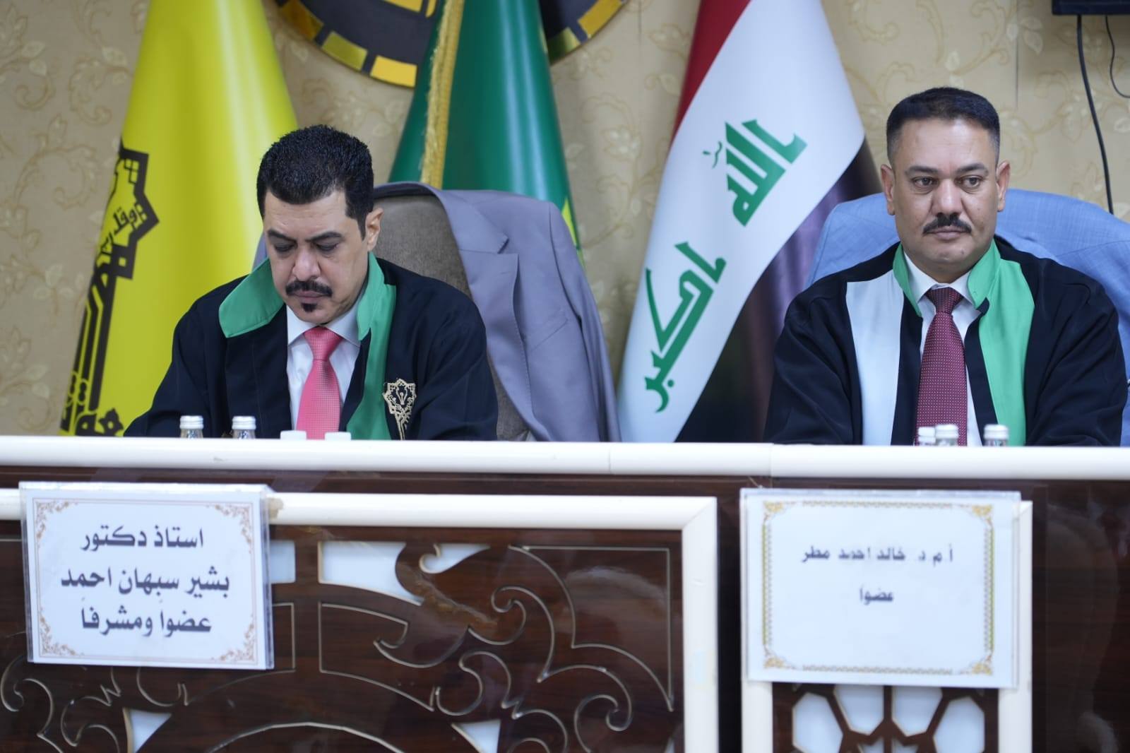 وخلال حضوره، أكد رئيس الجامعة حرص رئاسة جامعة تكريت على دعم برامج الدراسات العليا وتعزيز البحث العلمي، مشيراً إلى أن الجامعة تسعى إلى تهيئة بيئة أكاديمية متكاملة تتيح للباحثين فرصة الإبداع والإسهام في معالجة القضايا العلمية والقانونية التي تمس المجتمع وتواكب المتغيرات الدولية.