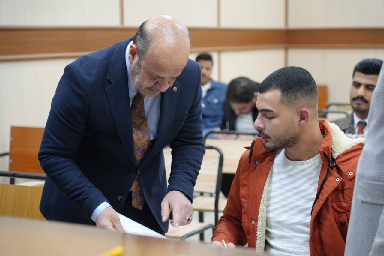 وكان في استقباله عميد كلية القانون الأستاذ الدكتور نايف أحمد ضاحي، حيث تجوّل رئيس الجامعة في عدد من القاعات الامتحانية، واطّلع على طبيعة الأسئلة ومدى ملائمتها للمناهج المقرّرة، فضلاً عن زيارته للجان الامتحانية.