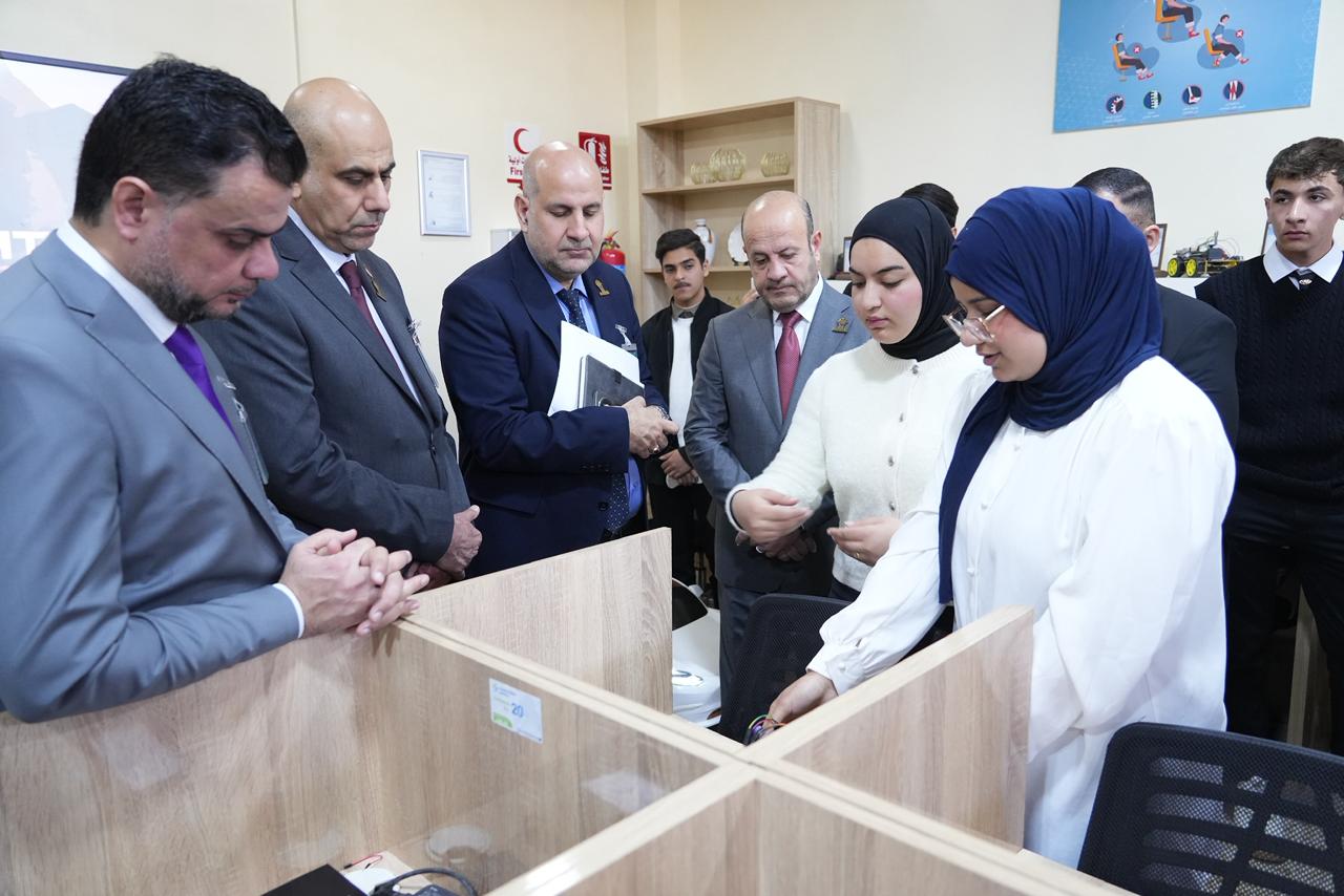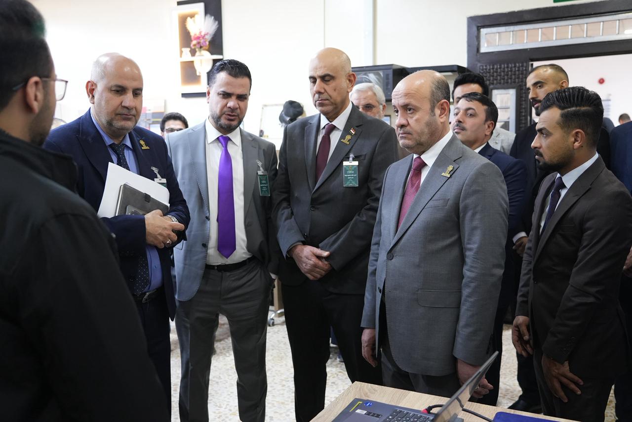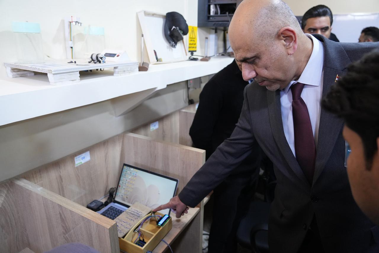 واطّلع السيد رئيس الجامعة والوفد المرافق له على الأجهزة الحديثة والتقنيات المتوفرة داخل المختبر، كما استمعوا إلى شرحٍ مفصّل عن المشاريع والابتكارات التي أنجزها طلبة المرحلة الأولى، والتي عكست مستوى الإبداع والمهارات العملية التي يتمتع بها طلبة الكلية، ولاسيما في مجالات الذكاء الاصطناعي والتطبيقات الذكية.