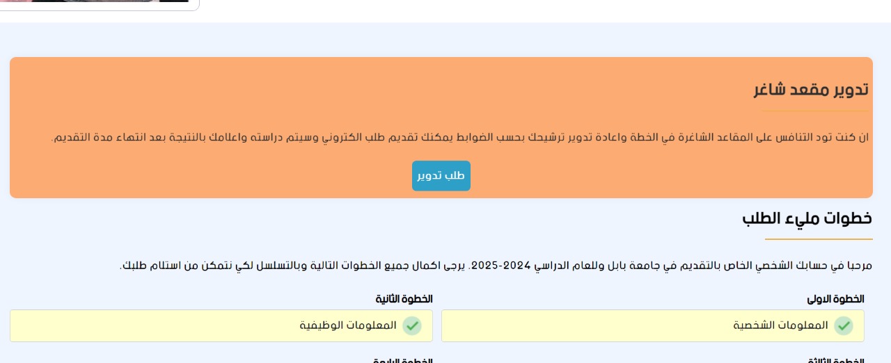 انطلقت خدمة ارسال طلب تدوير الى المقاعد الشاغرة في خطة القبول للعام الدراسي 2024-2025 والتي تسمح للمتقدمين على قنوات القبول العام والخاص والناجحين بالامتحان التنافسي بالتدوير لشغل مقعد شاغر سواء في العام او الخاص او الامتيازات. عند قبول التدوير سيكون المقعد المخصص للطالب المقبول على النفقة الخاصة ويتحمل اجور الدراسة , غير مسموح لذوي الامتيازات بارسال طلبات تدوير , المتقدمين الراسبين بالامتحان التنافسي غير مسموح لهم ارسال طلبات تدوير،وبعد ارسال طلب تدوير يرجى الانتظار لغاية 7-8 لمعرفة نتيجة معالجة طلب التدوير.