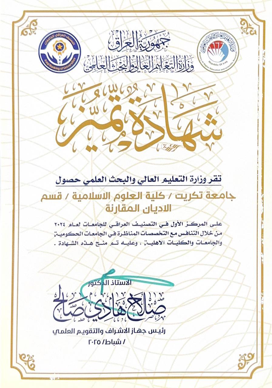 حصل قسم الفقه وأصوله وقسم الأديان المقارنة في كلية العلوم الإسلامية بجامعة تكريت على شهادة تميز من قبل جهاز الإشراف والتقويم العلمي في وزارة التعليم العالي والبحث العلمي، تقديراً للجهود العلمية والأكاديمية المتميزة التي قدّماها خلال الفترة الماضية.