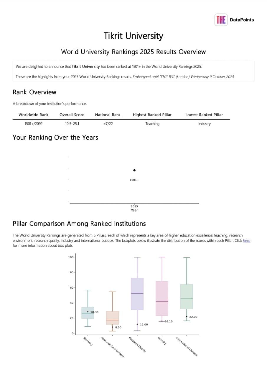 وفي تصريح له على هذا الإنجاز، أثنى السيد رئيس الجامعة على الجهود المبذولة من قبل اللجنة المركزية، وبارك لجميع منتسبي الجامعة هذا الإنجاز الذي يعكس مكانة جامعة تكريت المرموقة على الساحة الأكاديمية العالمية. وحث الجميع على مواصلة العمل الجاد لتحقيق نتائج أفضل في التصنيفات القادمة مثل تصنيف QS وتصنيف Green Metrics وغيرها.