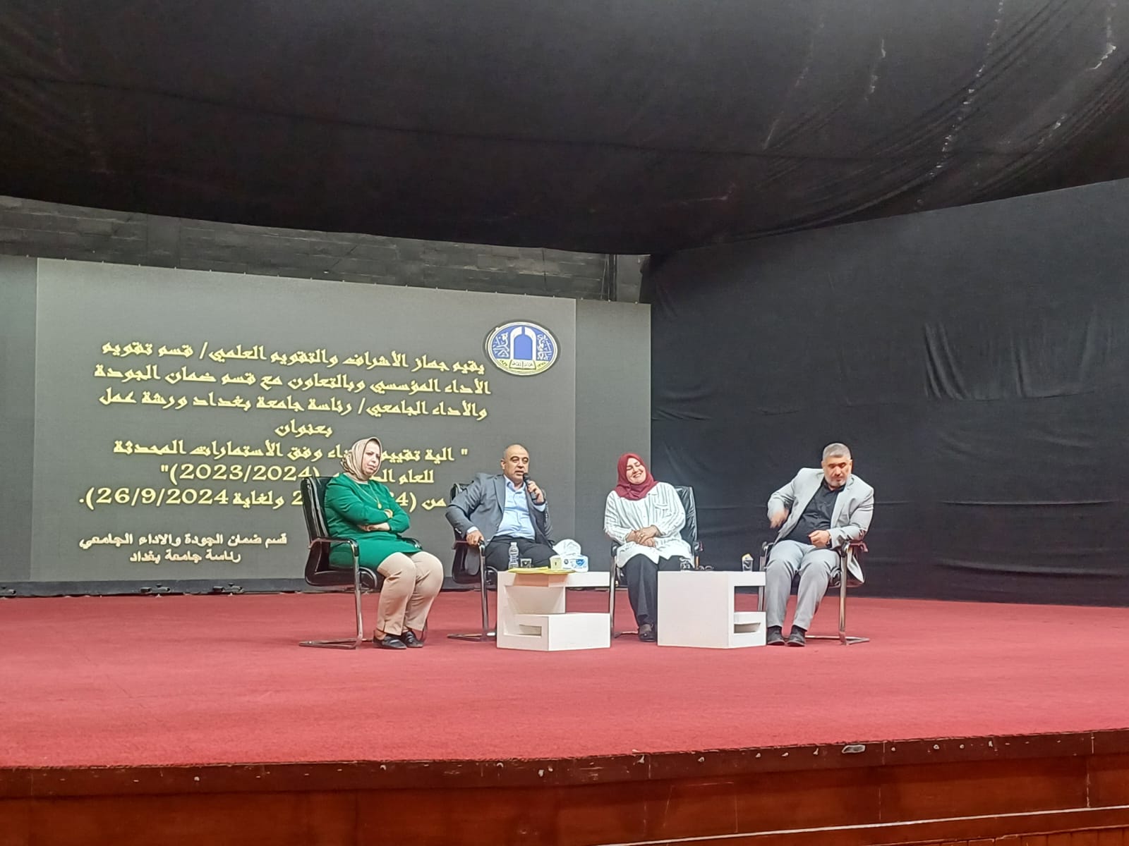 في الورشة التي اقامها جهاز الإشراف والتقويم العلمي قسم تقويم الأداء المؤسسي بالتعاون مع قسم اداء الجودة في جامعة بغداد لمناقشة اهم التحديثات التي تم إدراجها في استمارات تقييم الاداء وآلية التعامل معها لتفادي حدوث اي مشكلة في التقييم عقدت على قاعة الحكيم في جامعة بغداد يوم الأربعاء الموافق ٢٥/ ٩/ ٢٠٢٤