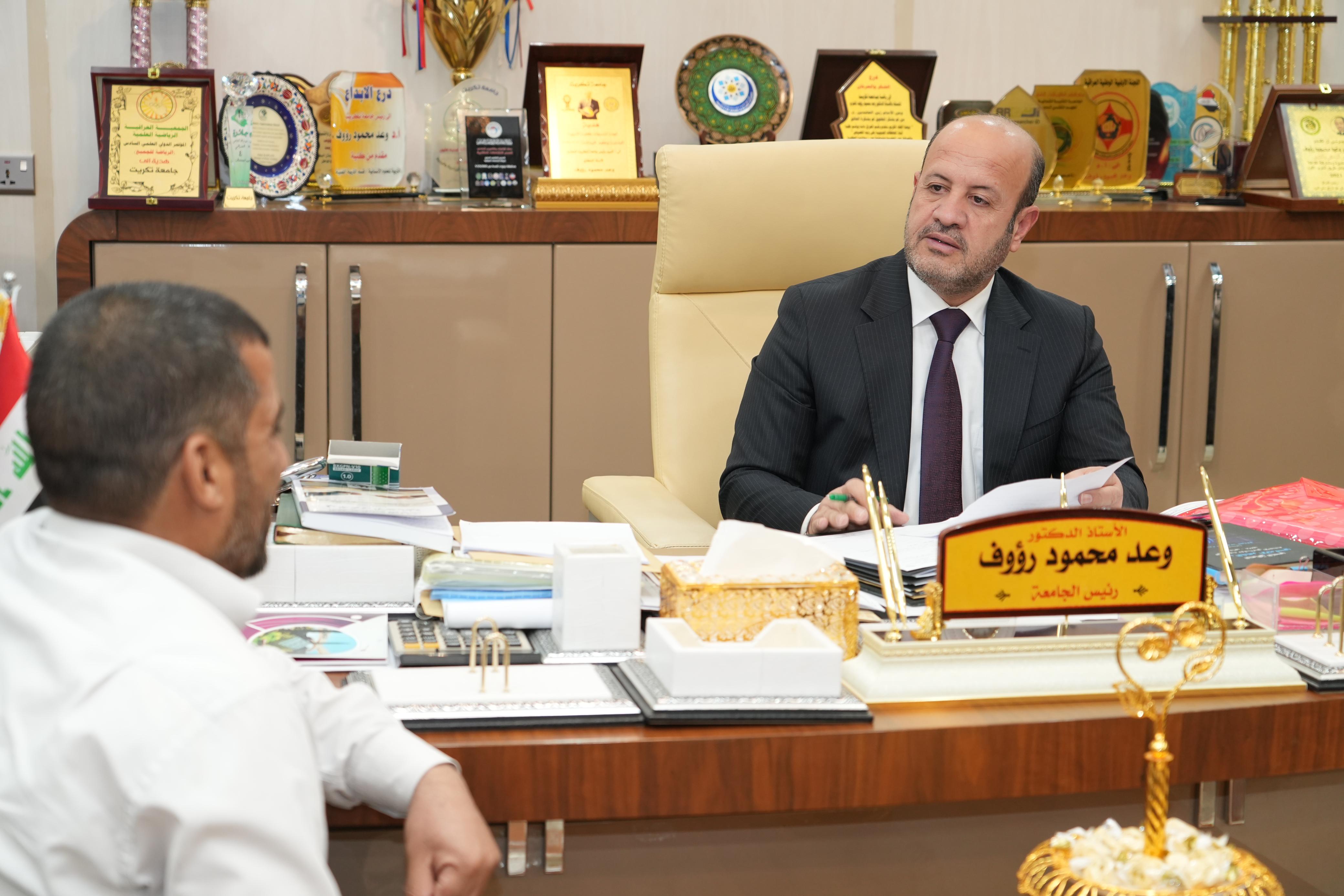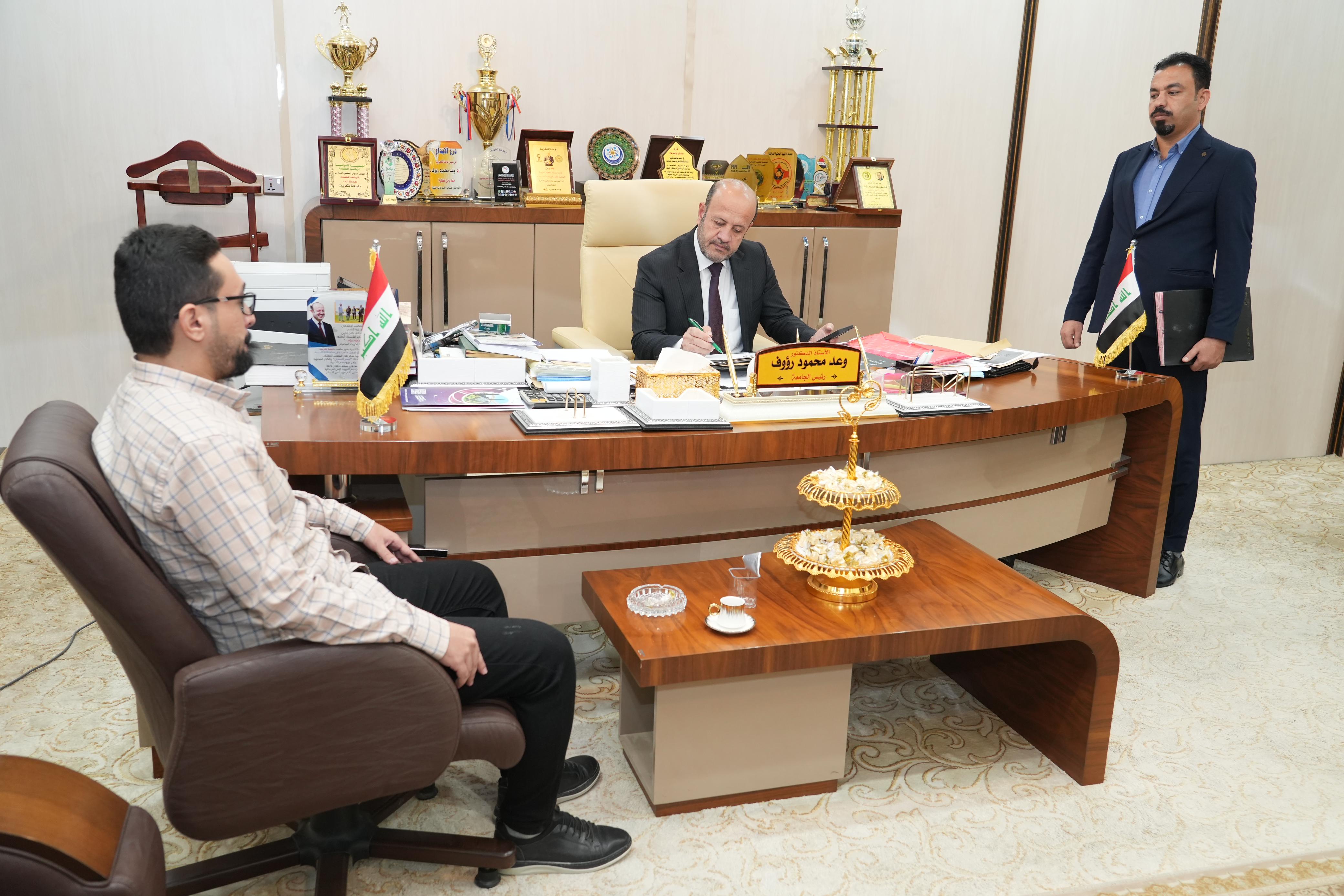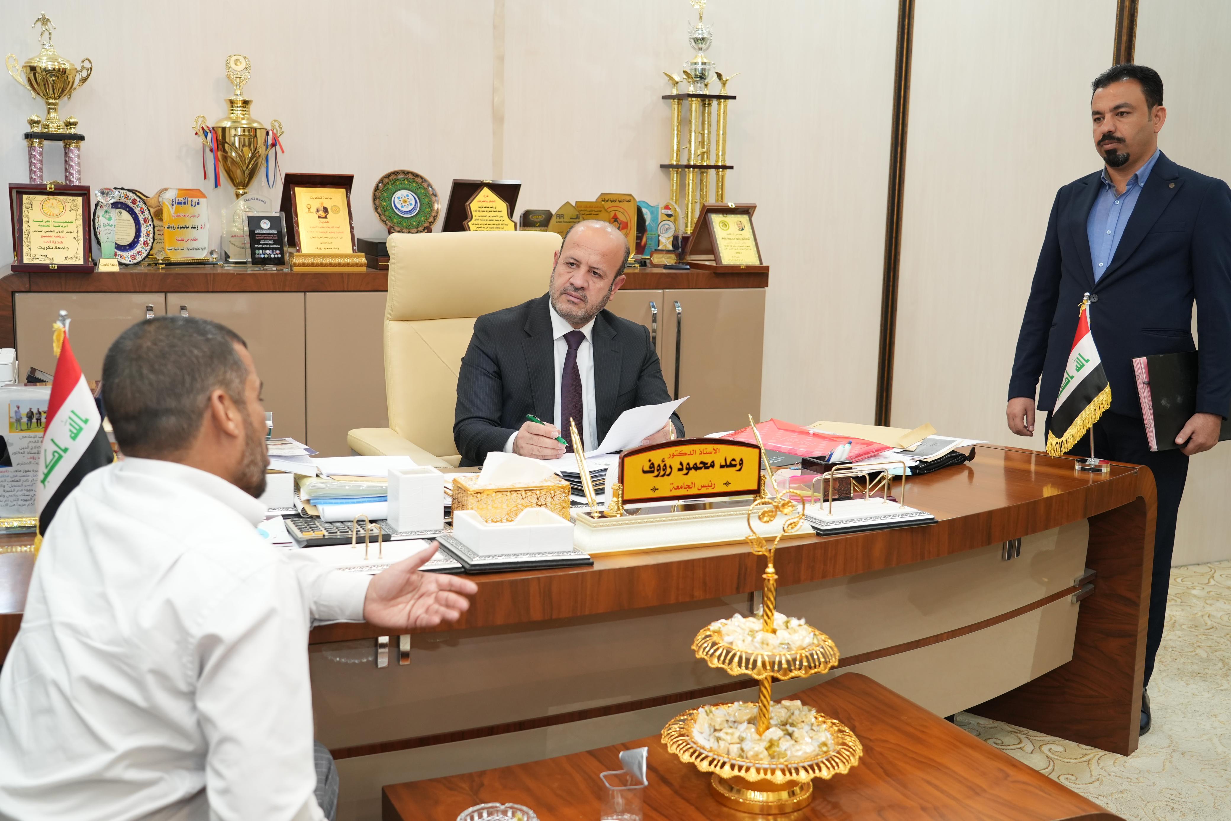 ضمن برنامج المقابلات الاسبوعي لرئيس الجامعة عبر استمارة المقابلات التي وضعتها شعبة شؤون المواطنين التقى الاستاذ الدكتور وعد محمود رؤوف رئيس جامعة تكريت اليوم الثلاثاء الموافق ٢/ ٧/ ٢٠٢٤ في مكتبه عدداً من الطلبة ومنتسبي الجامعة والمواطنين في اطار المتابعة الدائمة والمستمرة لاحتياجات منتسبي وطلبة الجامعة والمواطنين حيث استمع رئيس الجامعة الى احتياجاتهم ومشاكلهم ووجه الجهات ذات العلاقة بتذليل جميع العقبات وفق الاطر القانونية وضمن توجيهات وزارة التعليم العالي والبحث العلمي