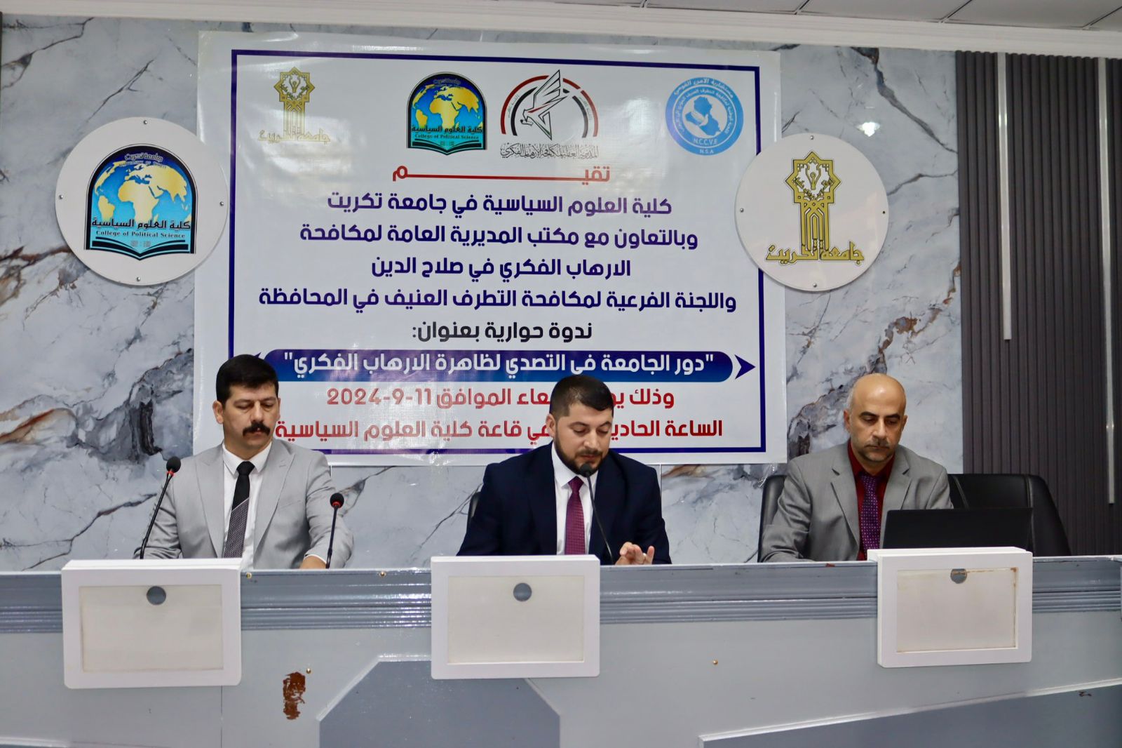 انطلاقا من دور الجامعة في نشر الوعي والثقافة ومن مبدأ التعاون بين الجامعة ومؤسسات الدولة الاخرى وبرعاية السيد رئيس جامعة تكريت الأستاذ الدكتور وعد محمود رؤوف اقامت كلية العلوم السياسية بالتعاون مع المديرية العامة لمكافحة الإرهاب الفكري في صلاح الدين واللجنة الفرعية لمكافحة التطرف العنيف في المحافظة ندوة حوارية بعنوان "دور الجامعة في التصدي لظاهرة الإرهاب الفكري" اليوم الأربعاء الموافق 11/9/2024.
