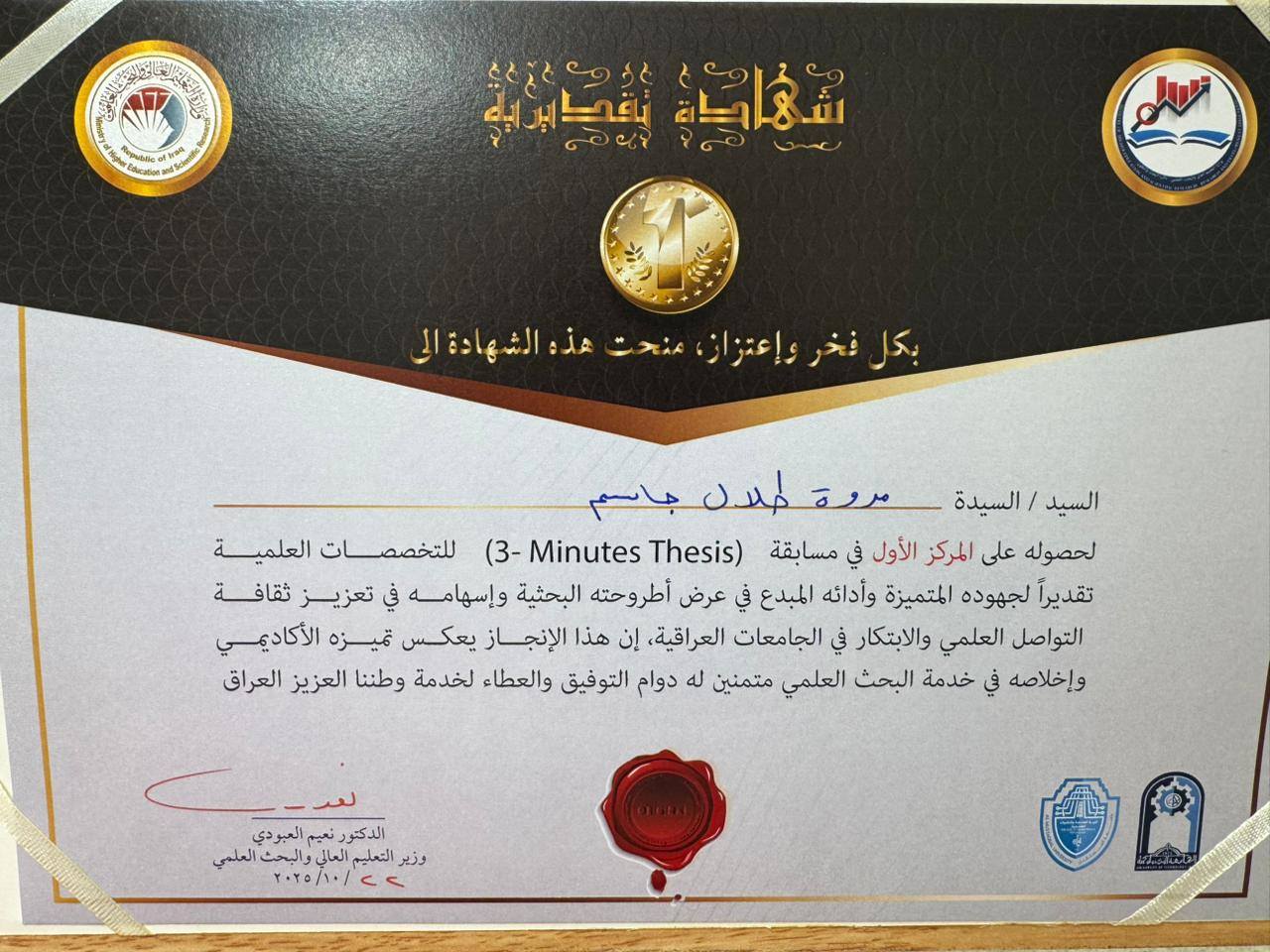 وتمكنت الطالبة مروة طلال جاسم، وهي طالبة دكتوراه في التخصصات العلمية، من نيل المرتبة الأولى على مستوى العراق، بمعدل 96.2%، متفوقةً على نخبة من طلبة الدراسات العليا من مختلف الجامعات العراقية.