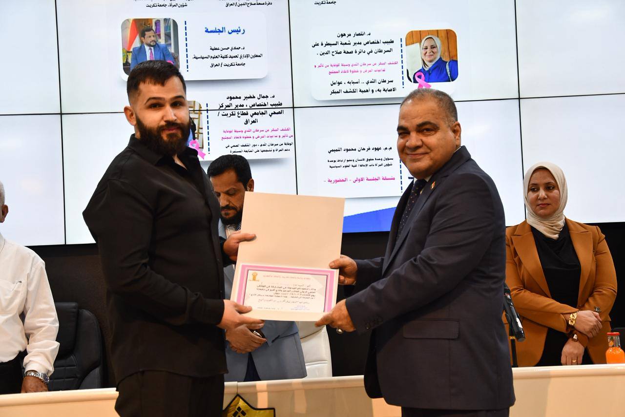 وأكد المساعد العلمي والذي حضر نيابةً عن السيد رئيس الجامعة، أن جامعة تكريت تضع خدمة الإنسان وتعزيز الوعي الصحي ضمن أولوياتها، مشيداً بالجهود الوطنية والدولية التي تتضافر في سبيل مكافحة سرطان الثدي ودعم المصابات والمتعافيات نفسيًا واجتماعياً.