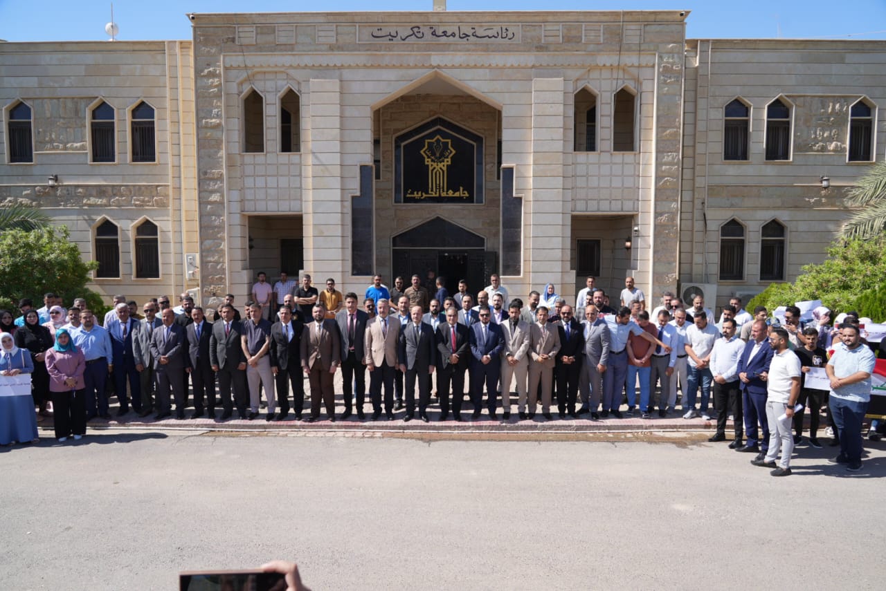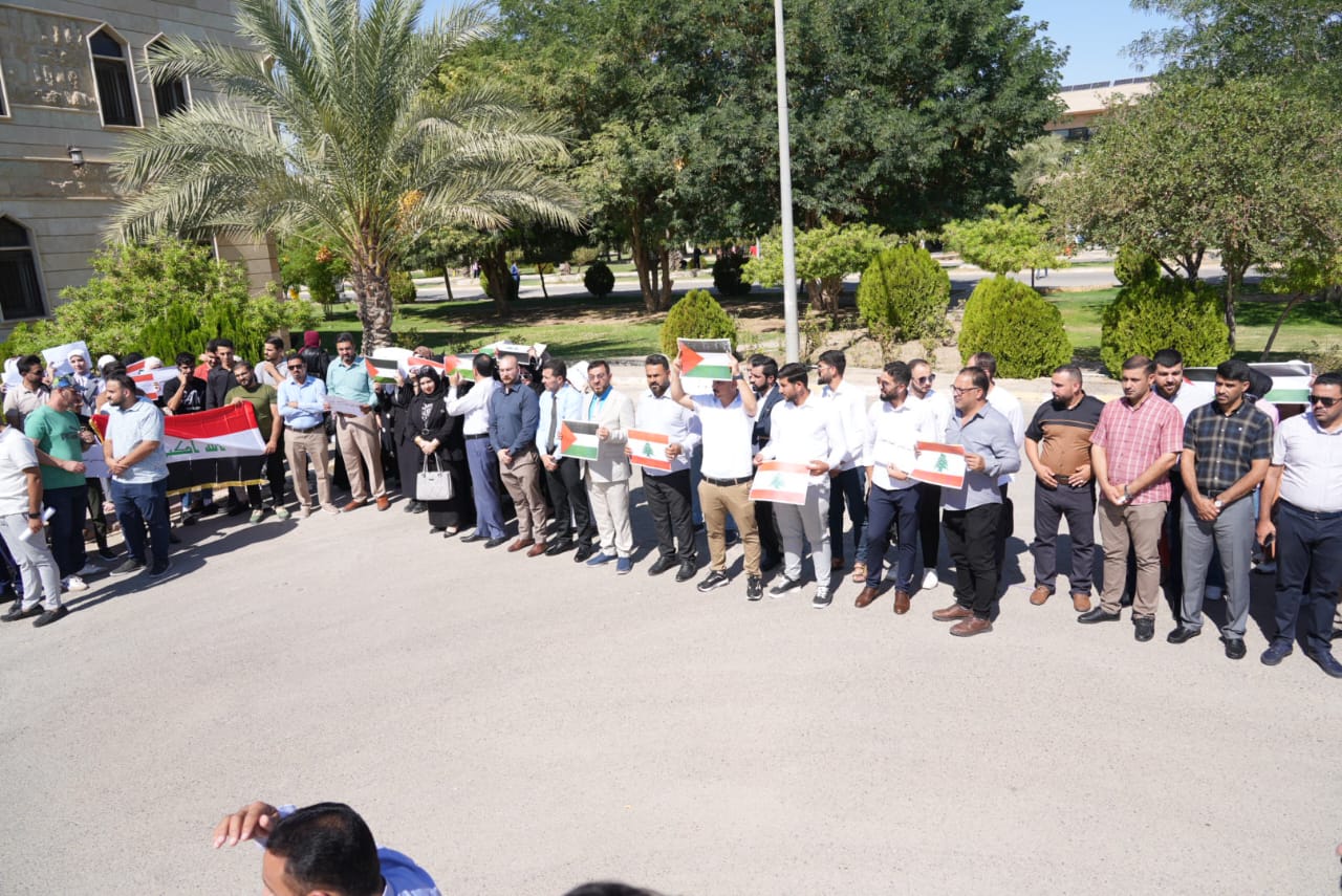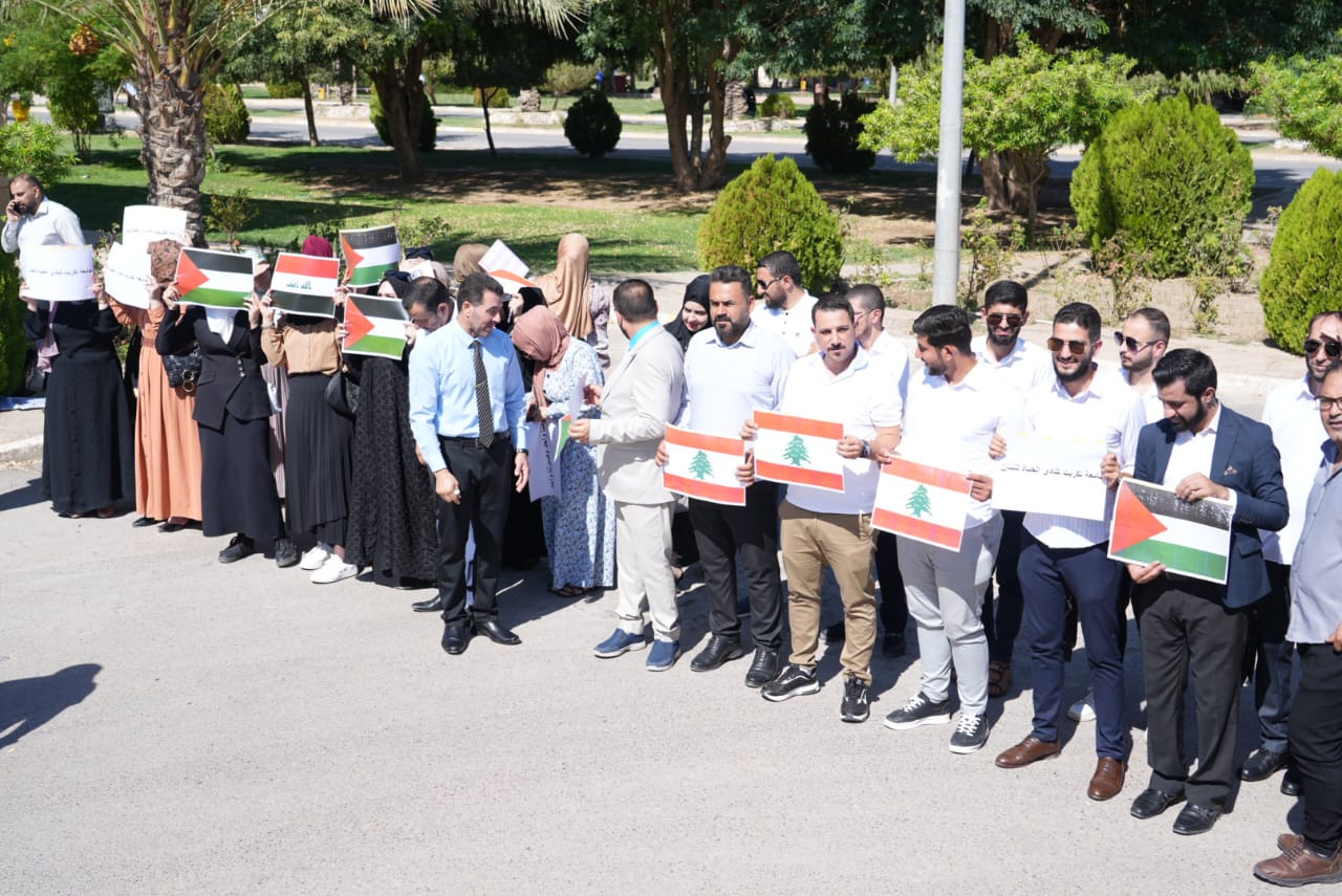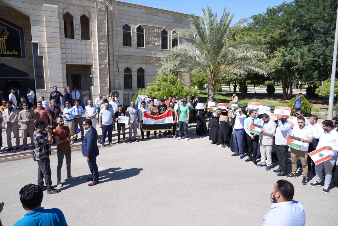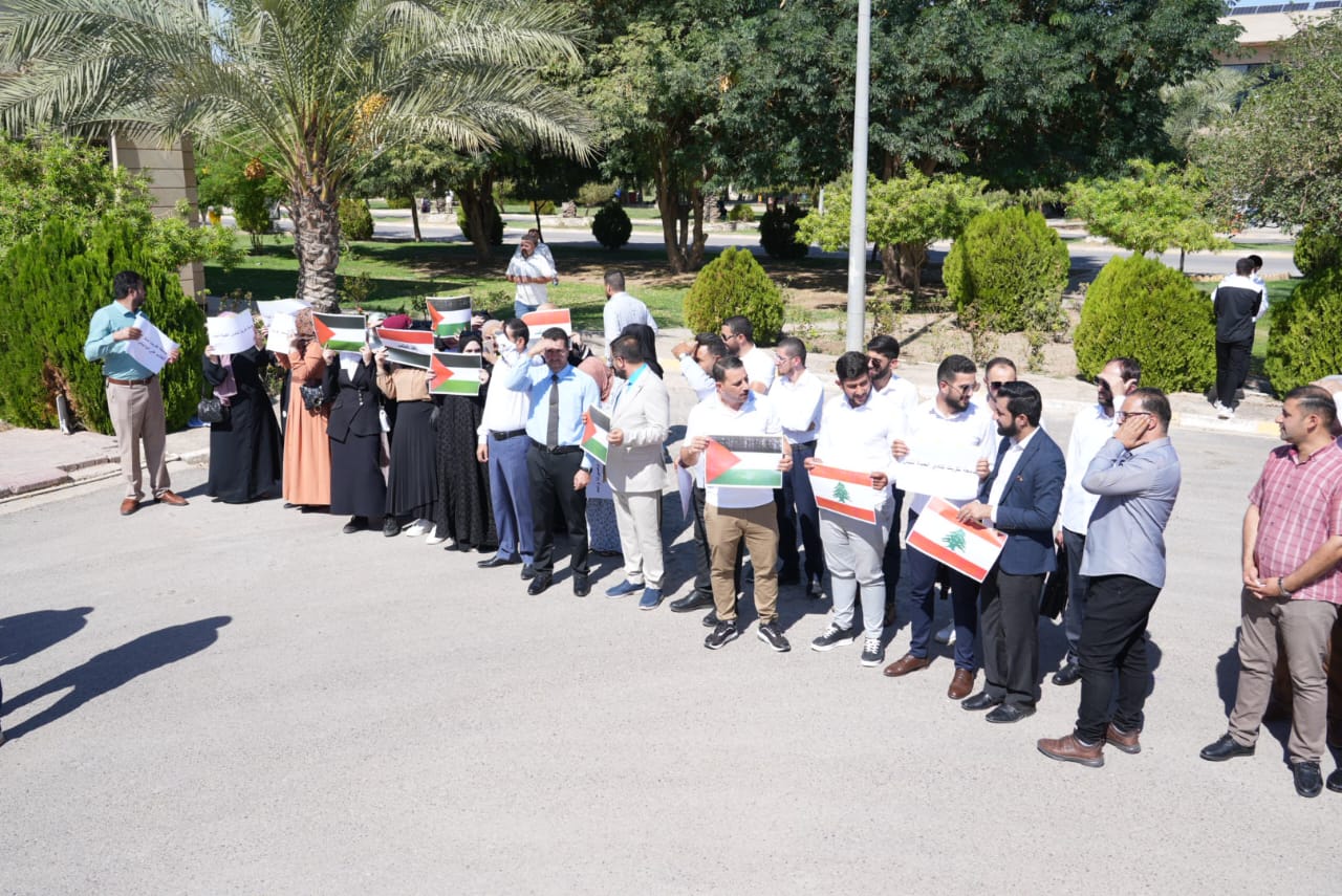 تنفيذا لتوجيهات وزارة التعليم العالي والبحث العلمي نظمت جامعة تكريت بحضور الاستاذ الدكتور وعد محمود رئيس جامعة تكريت والاستاذ الدكتور حسن حسين ابراهيم مساعد رئيس الجامعة للشؤون العلمية وعدد من السادة عمداء الكليات والموظفين والطلبة وقفة استنكارية واحتجاجية ضد العدوان الهمجي الذي يتعرض له الشعبين الفلسطيني واللبناني الشقيقيين على يد قوى الاحتلال والظلام