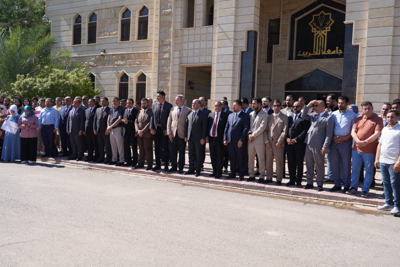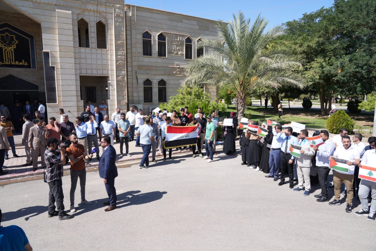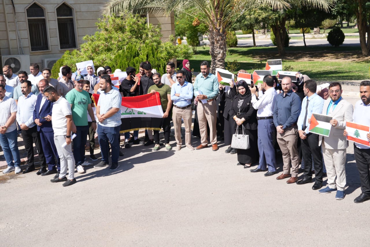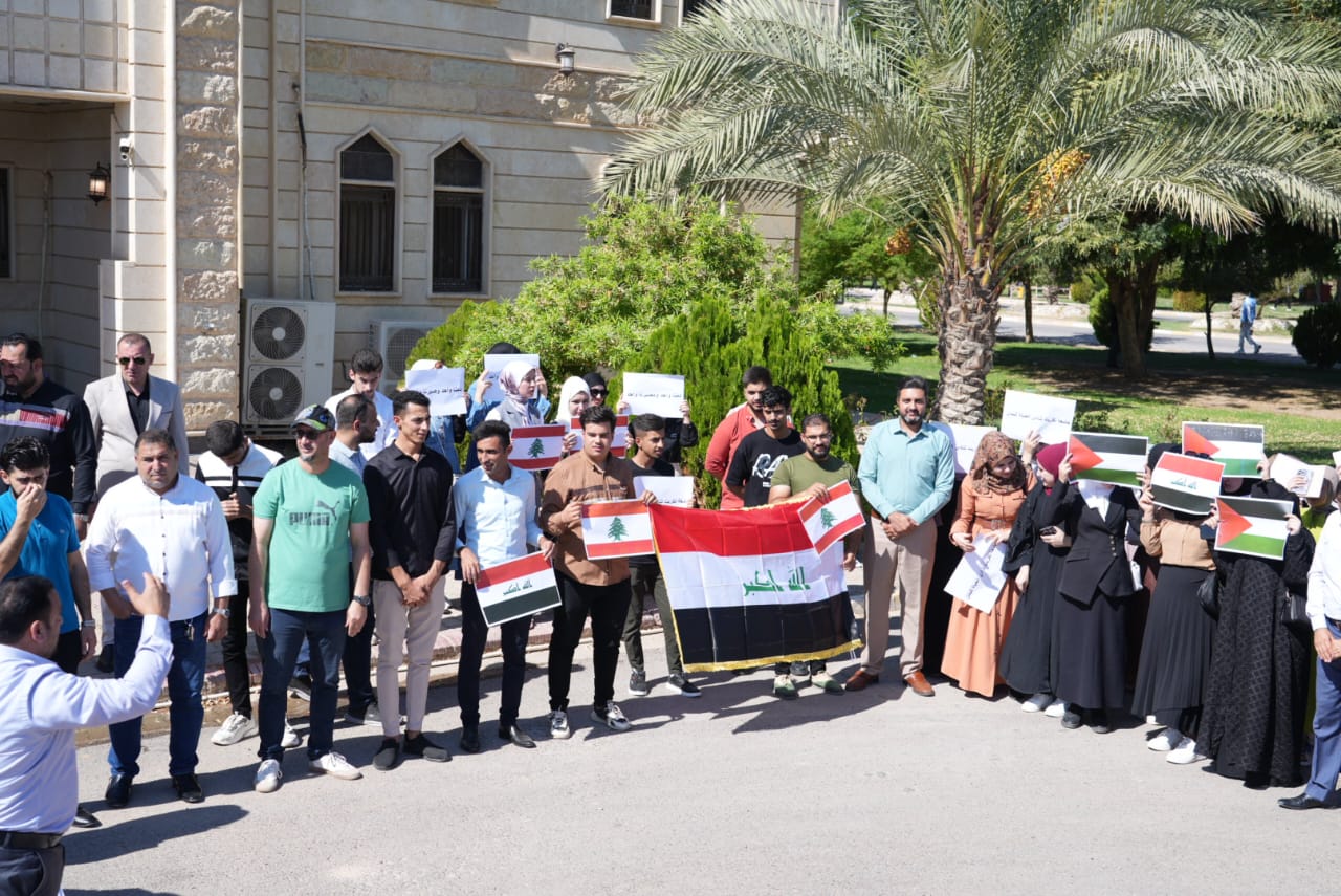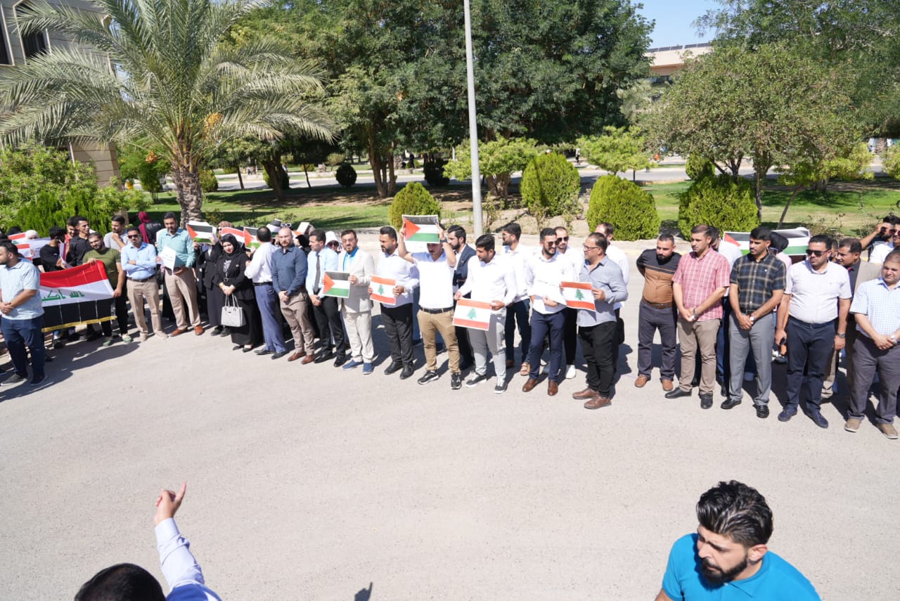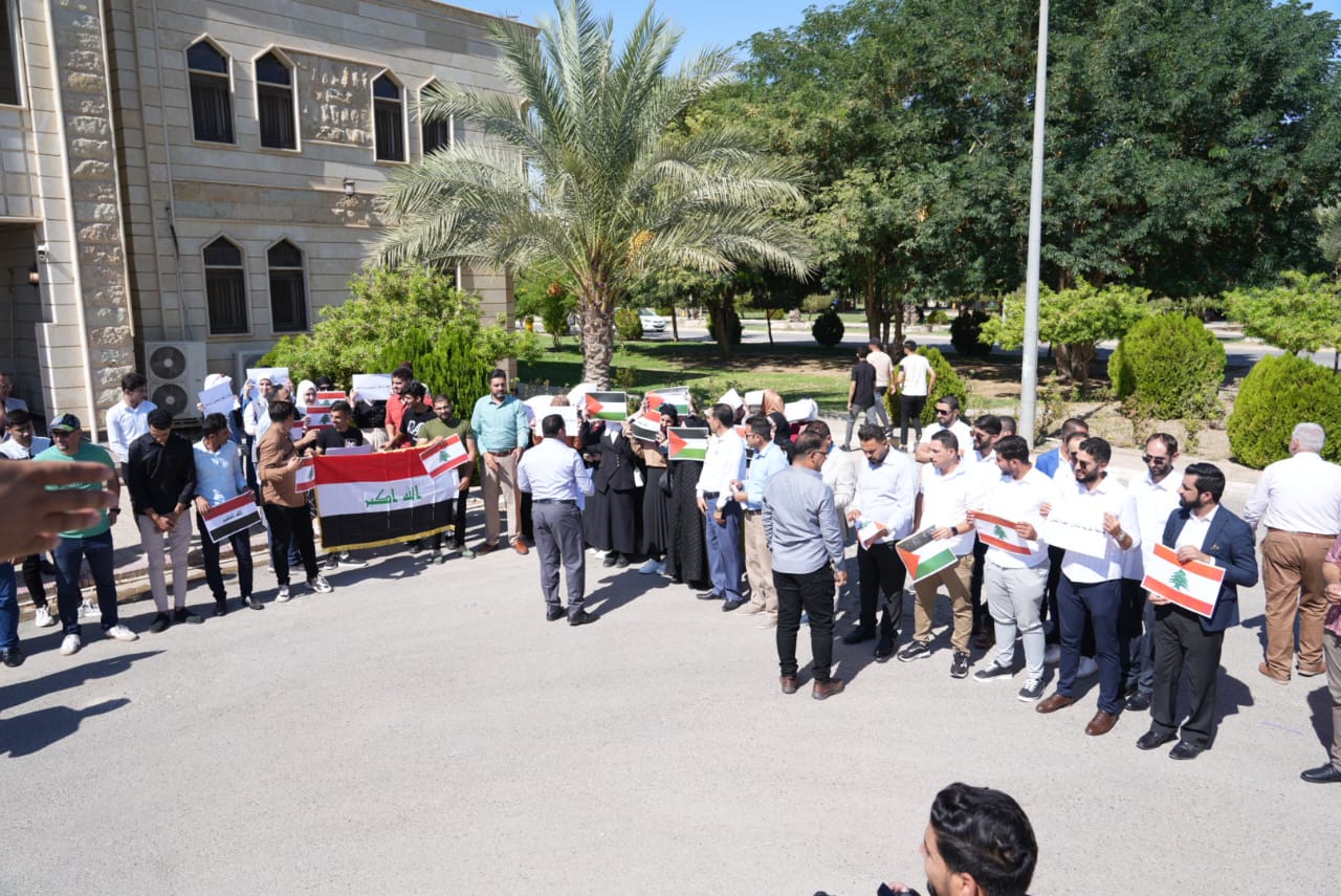 تنفيذا لتوجيهات وزارة التعليم العالي والبحث العلمي نظمت جامعة تكريت بحضور الاستاذ الدكتور وعد محمود رئيس جامعة تكريت والاستاذ الدكتور حسن حسين ابراهيم مساعد رئيس الجامعة للشؤون العلمية وعدد من السادة عمداء الكليات والموظفين والطلبة وقفة استنكارية واحتجاجية ضد العدوان الهمجي الذي يتعرض له الشعبين الفلسطيني واللبناني الشقيقيين على يد قوى الاحتلال والظلام