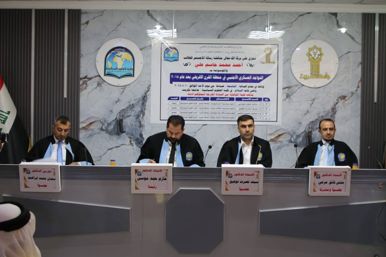 كما حضر المساعد العلمي مناقشة ، رسالة الماجستير المقدمة من الطالب أحمد محمد جاسم، الموسومة: “التواجد العسكري الأجنبي في منطقة القرن الإفريقي بعد عام 2015”، والتي تناولت أبعاد وأسباب الوجود العسكري الدولي في المنطقة وانعكاساته السياسية والأمنية.