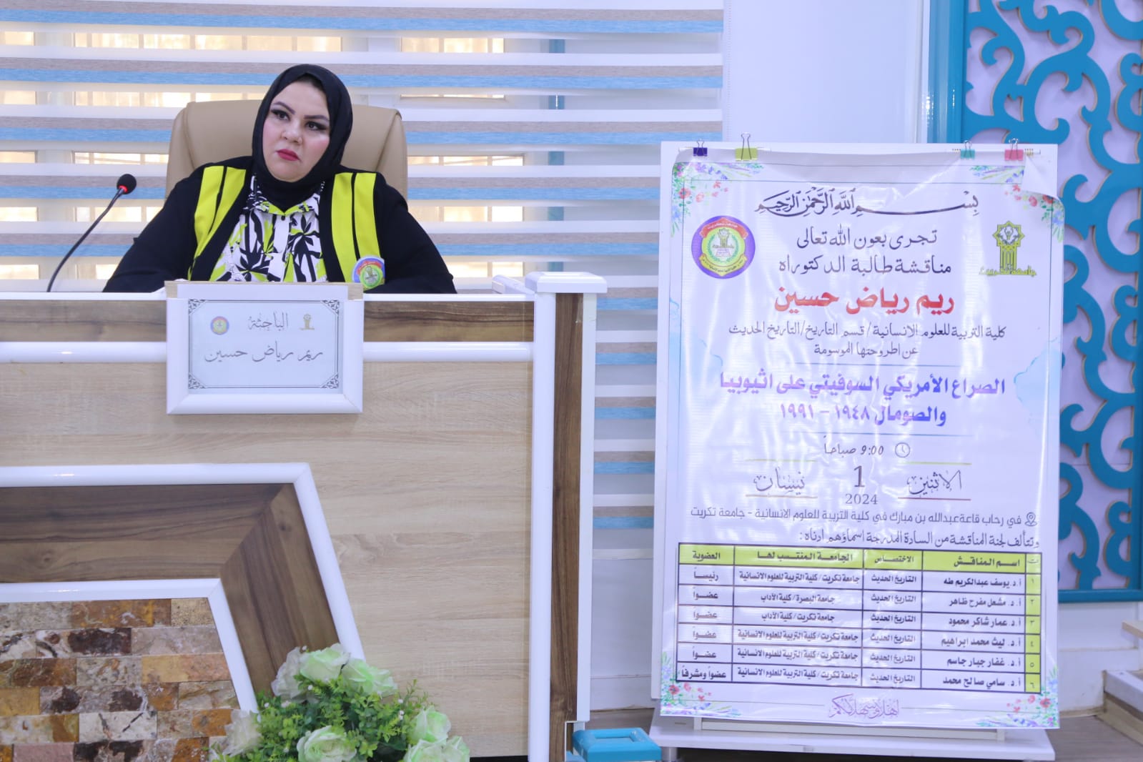 ضمن الجولات التفقدية والمتابعة المستمرة لكليات واقسام ومفاصل الجامعة حضر الاستاذ الدكتور فؤاد فرحان حسين مساعد رئيس الجامعة للشؤون الادارية مناقشة اطروحة دكتوراه بكلية التربية للعلوم الانسانية قسم التأريخ للطالبة (ريم رياض حسين) عن رسالتها الموسومة (الصراع الامريكي السوفيتي على اثيوبيا والصومال ١٩٤٨- ١٩٩١)