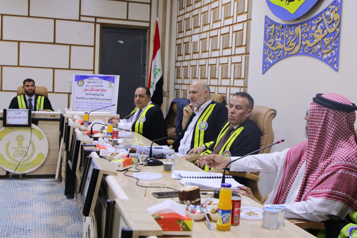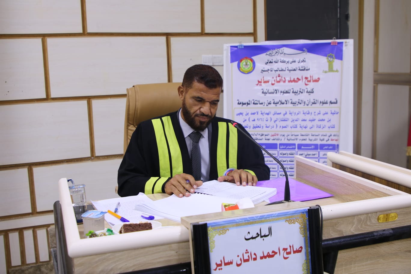 قسم علوم القرآن والتربية الاسلامية عن رسالته الموسومة (حاشية على شرح وقاية الرواية في مسائل الهداية لاحمد بن يحيى بن محمد حفيد سعد الدين التفتازالي (ت: ١١٦ هـ) من كتاب الزكاة الى نهاية كتاب الصوم) دراسة وتحقيق.