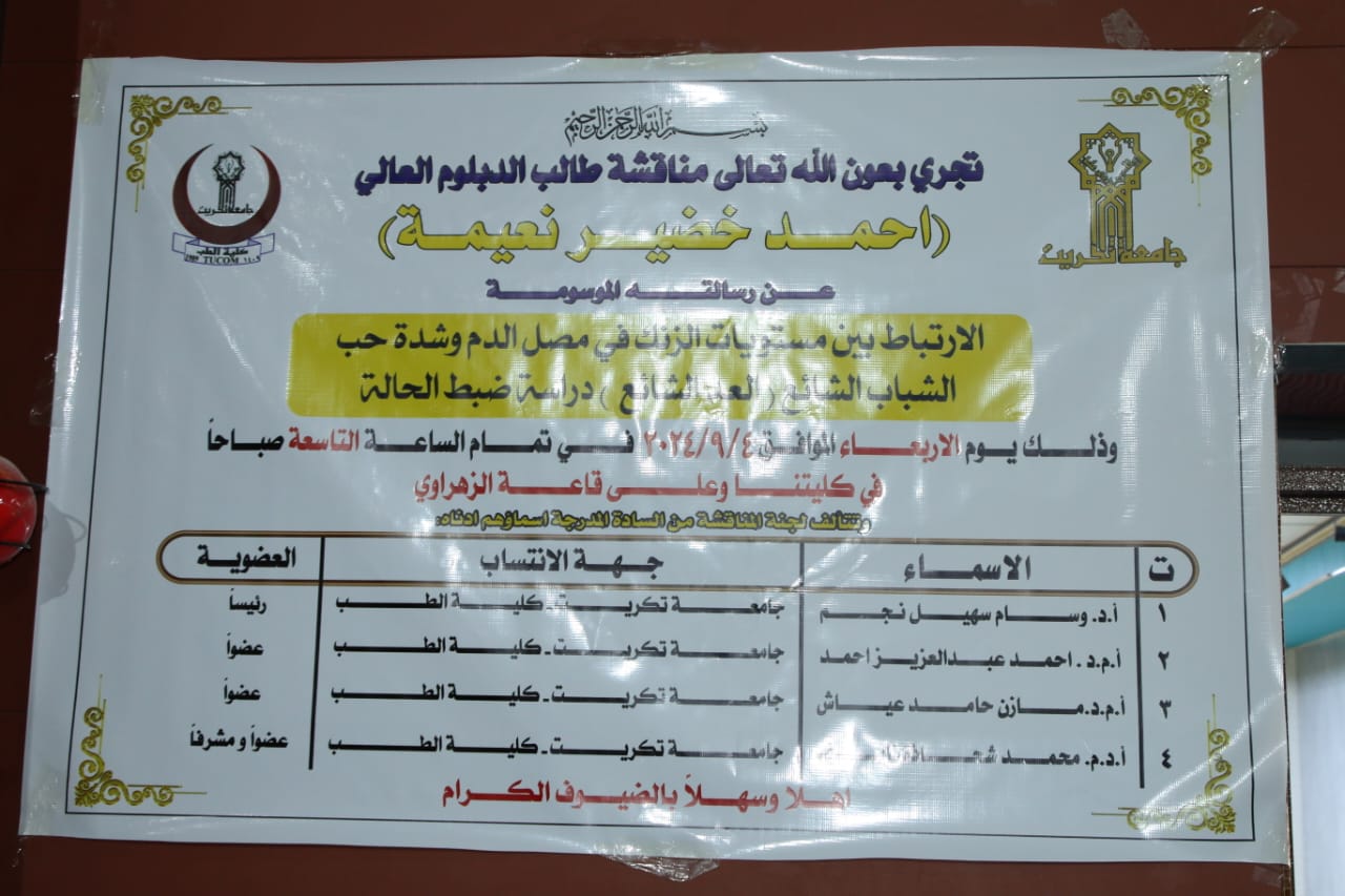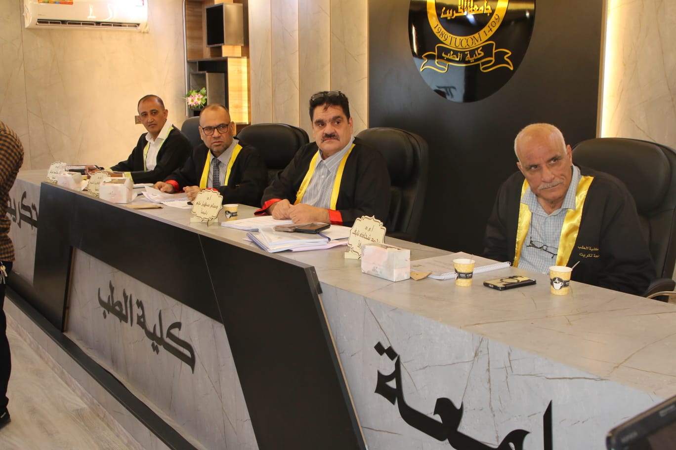 تنفيذا لتوجيهات الاستاذ الدكتور وعد محمود رؤوف رئيس جامعة تكريت حضر الاستاذ الدكتور حسن حسين ابراهيم مساعد رئيس الجامعة للشؤون العلمية اليوم الاربعاء الموافق 4/9/2024 عددا من المناقشات العلمية في كلية الطب حيث حضر المساعد العلمي مناقشة رسالة الدبلوم العالي للطالب ( احمد خضير نعيمة) ورسالة ماجستير للطالبة ( سوزان خالد محمد ) من كلية الطب.