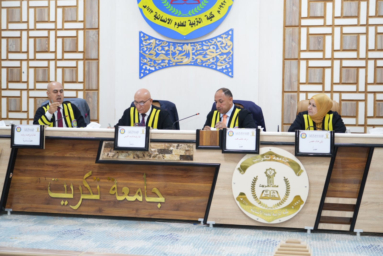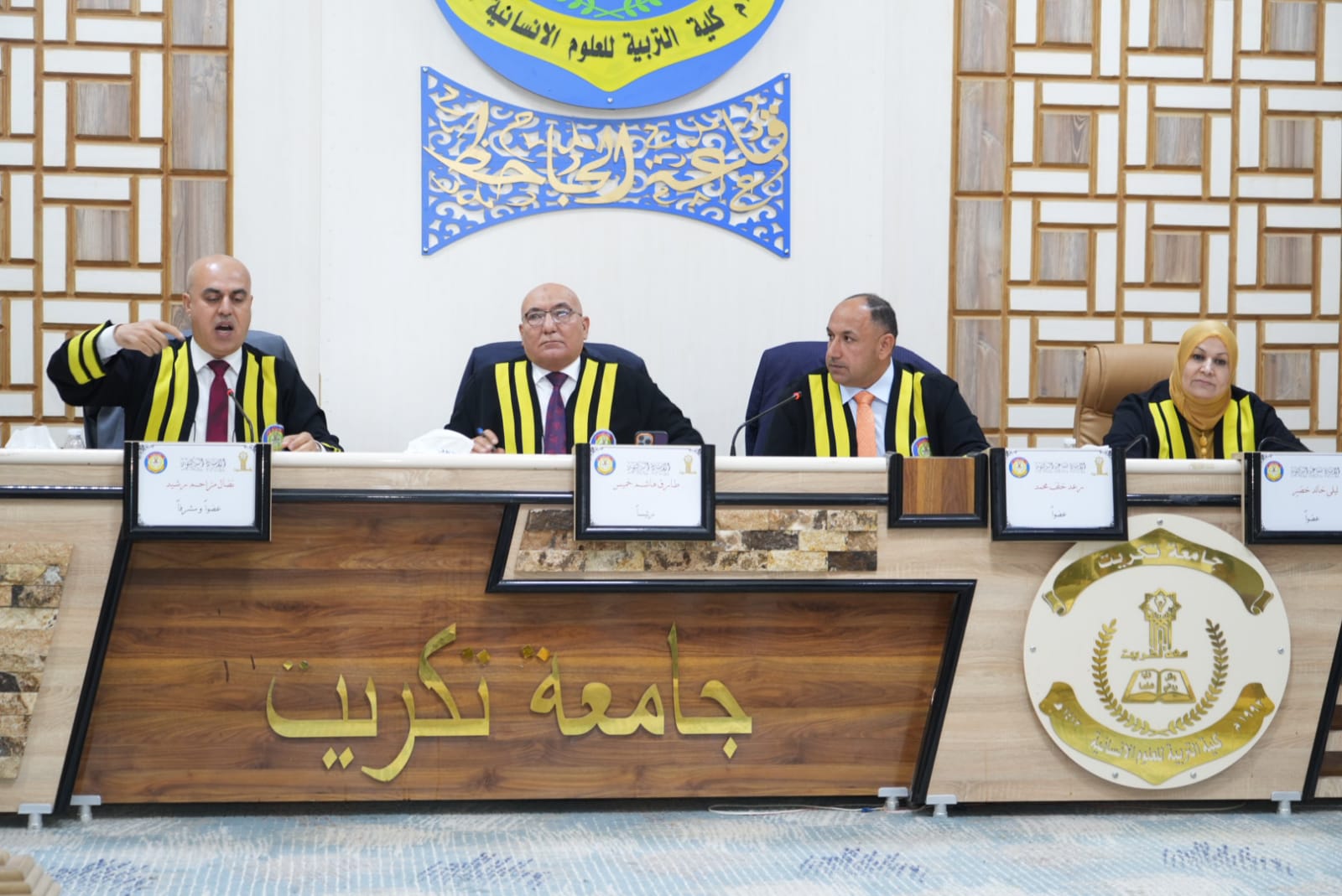 تنفيذا لتوجيهات الاستاذ الدكتور وعد محمود رؤوف رئيس جامعة تكريت وضمن الجولات التفقدية والمتابعة المستمرة لكليات واقسام ومفاصل الجامعة حضر الاستاذ الدكتور حسن حسين ابراهيم مساعد رئيس الجامعة للشؤون العلمية والاستاذ الدكتور فؤاد فرحان حسين مساعد رئيس الجامعة للشؤون الادارية مناقشة رسالة ماجستير في كلية التربية للعلوم الانسانية للطالب محمود عبدالله محيميد من قسم العلوم التربوية والنفسية والموسومة (اثر استراتيجية المحاكمة العقلية في تحصيل طلاب الصف الخامس الادبي في مادة الفلسفة وعلم النفس وتنمية قيمهم الاخلاقية) حضر المساعد العلمي بعدها مناقشة اطروحة دكتوراه للطالب خالد حميد لطيف من كلية الهندسة