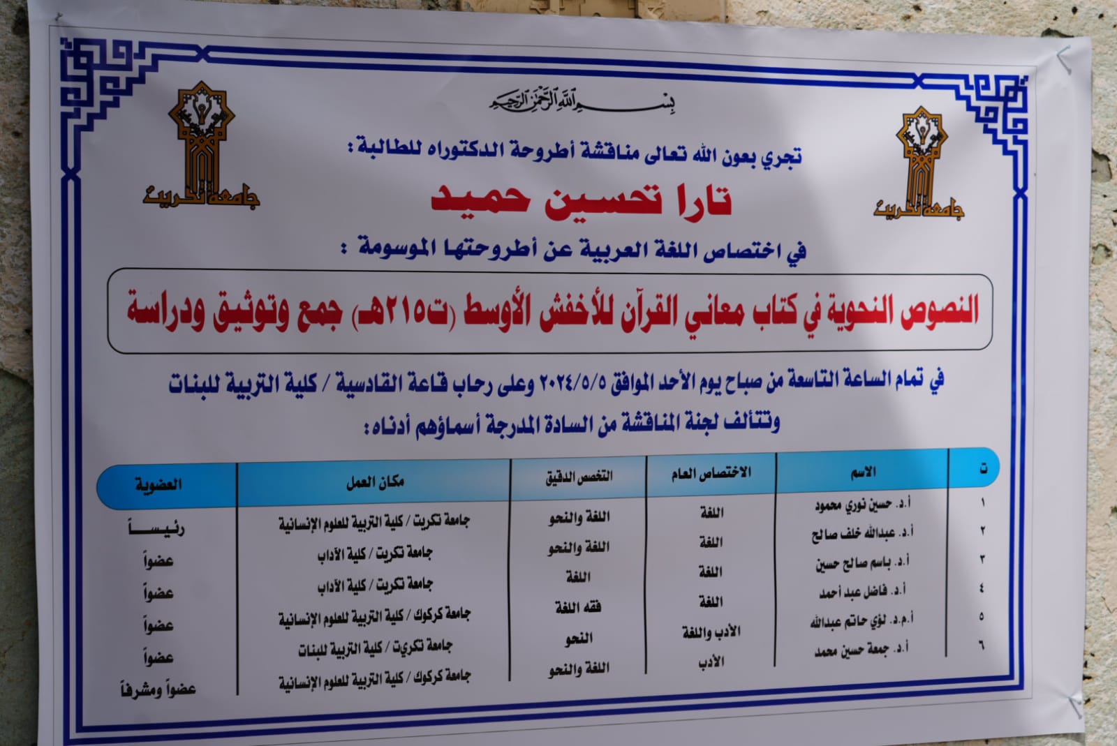 ضمن جولاته التفقدية ومتابعته المستمرة لكليات واقسام ومفاصل الجامعة حضر الاستاذ الدكتور وعد محمود رؤوف رئيس جامعة تكريت مناقشة اطروحة دكتوراه في كلية التربية للبنات للطالبة (تارا تحسين حميد) من قسم اللغة العربية عن اطروحتها الموسومة (النصوص النحوية في كتاب معاني القرآن للأخفش الأوسط (215 هجرية) جمع وتوثيق ودراسة)