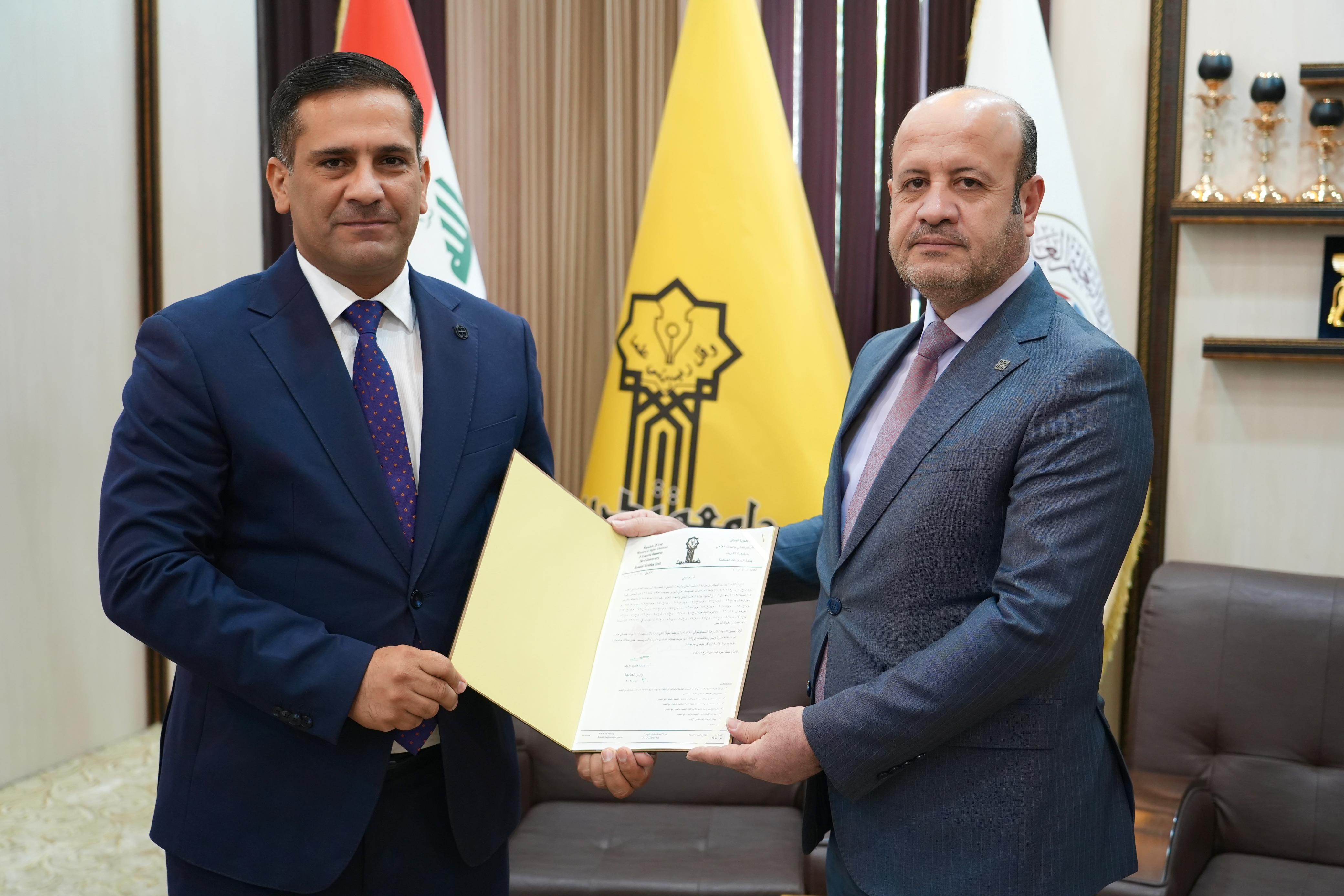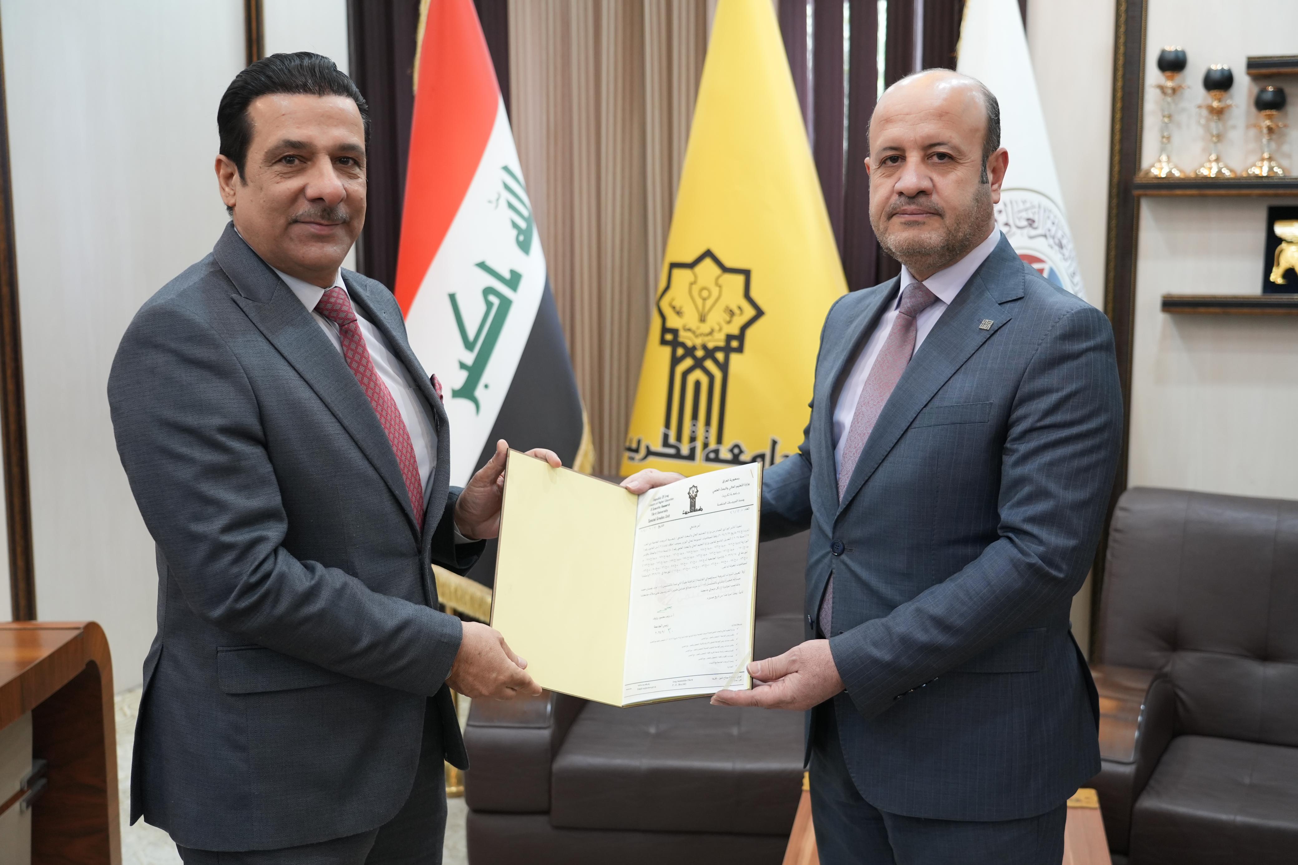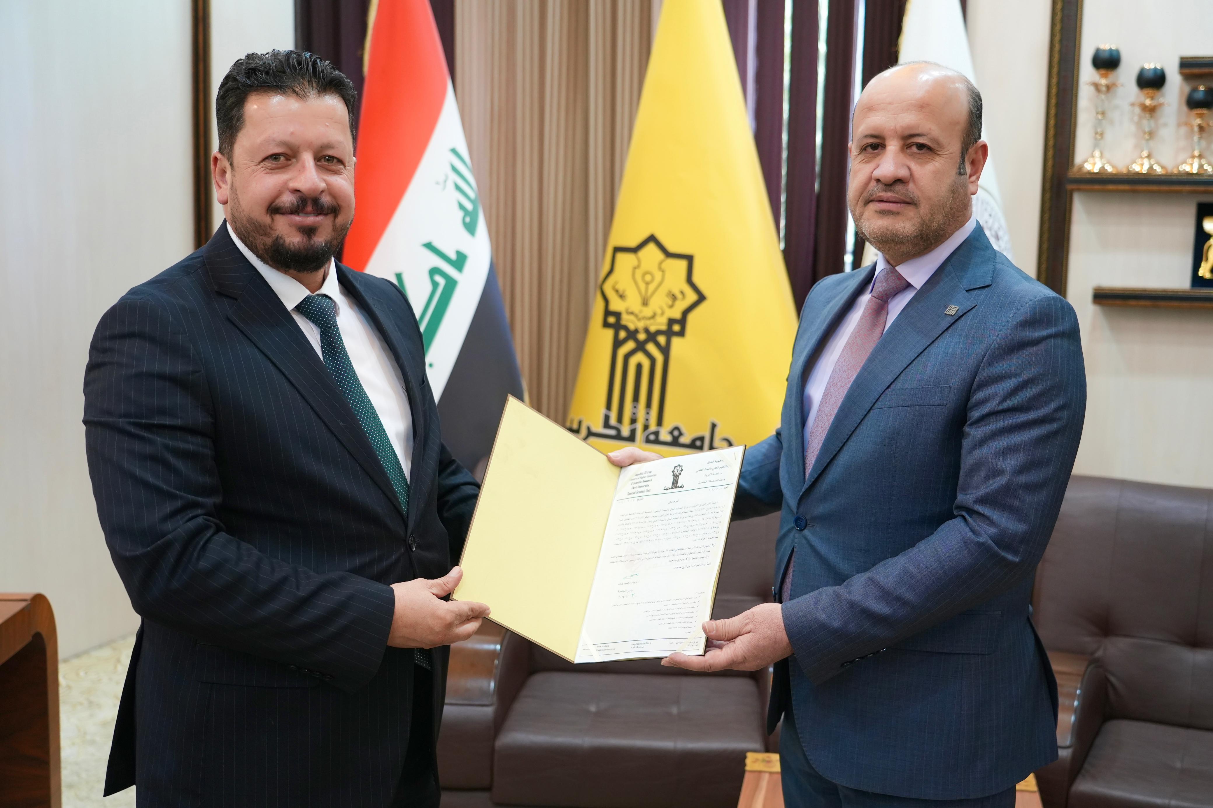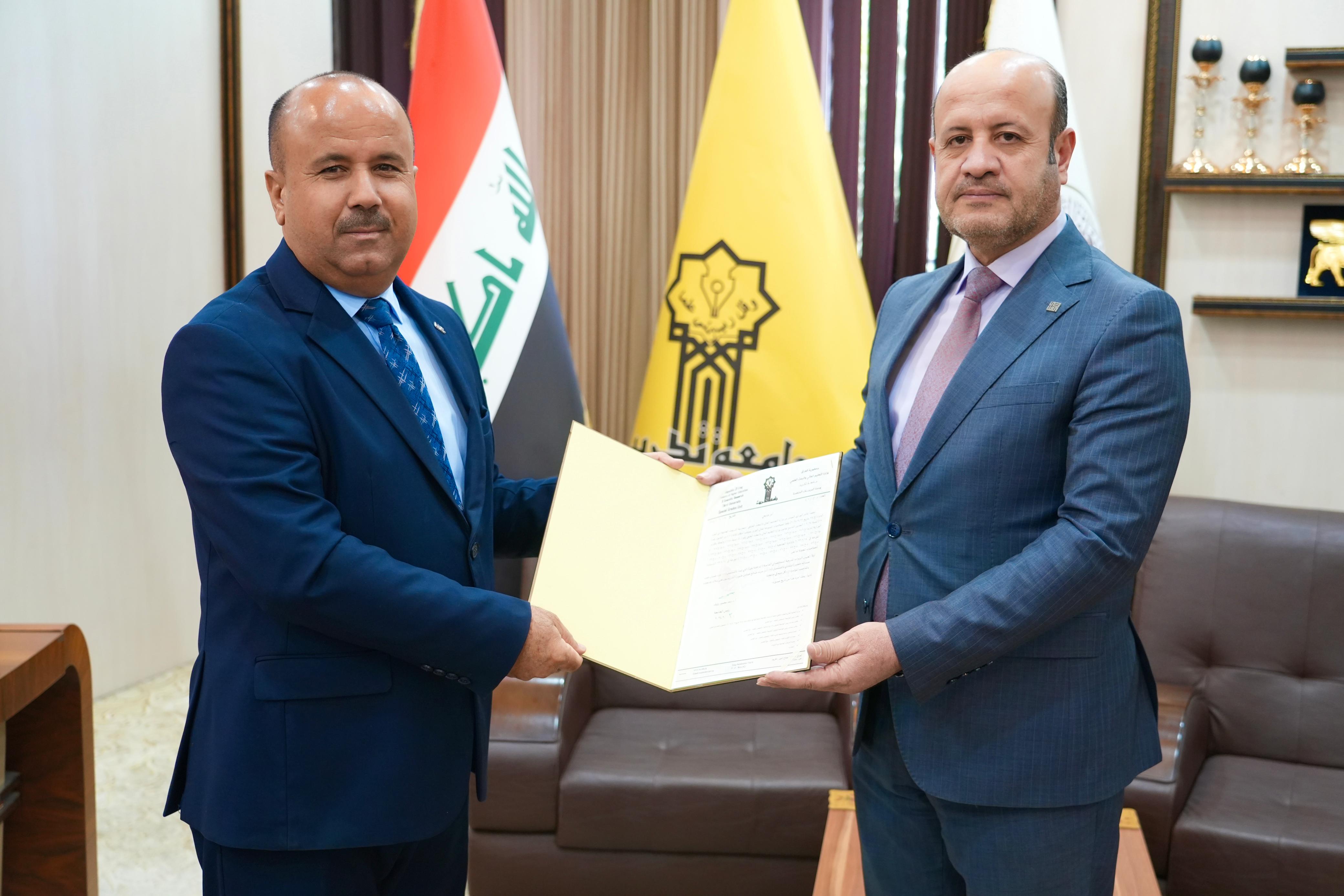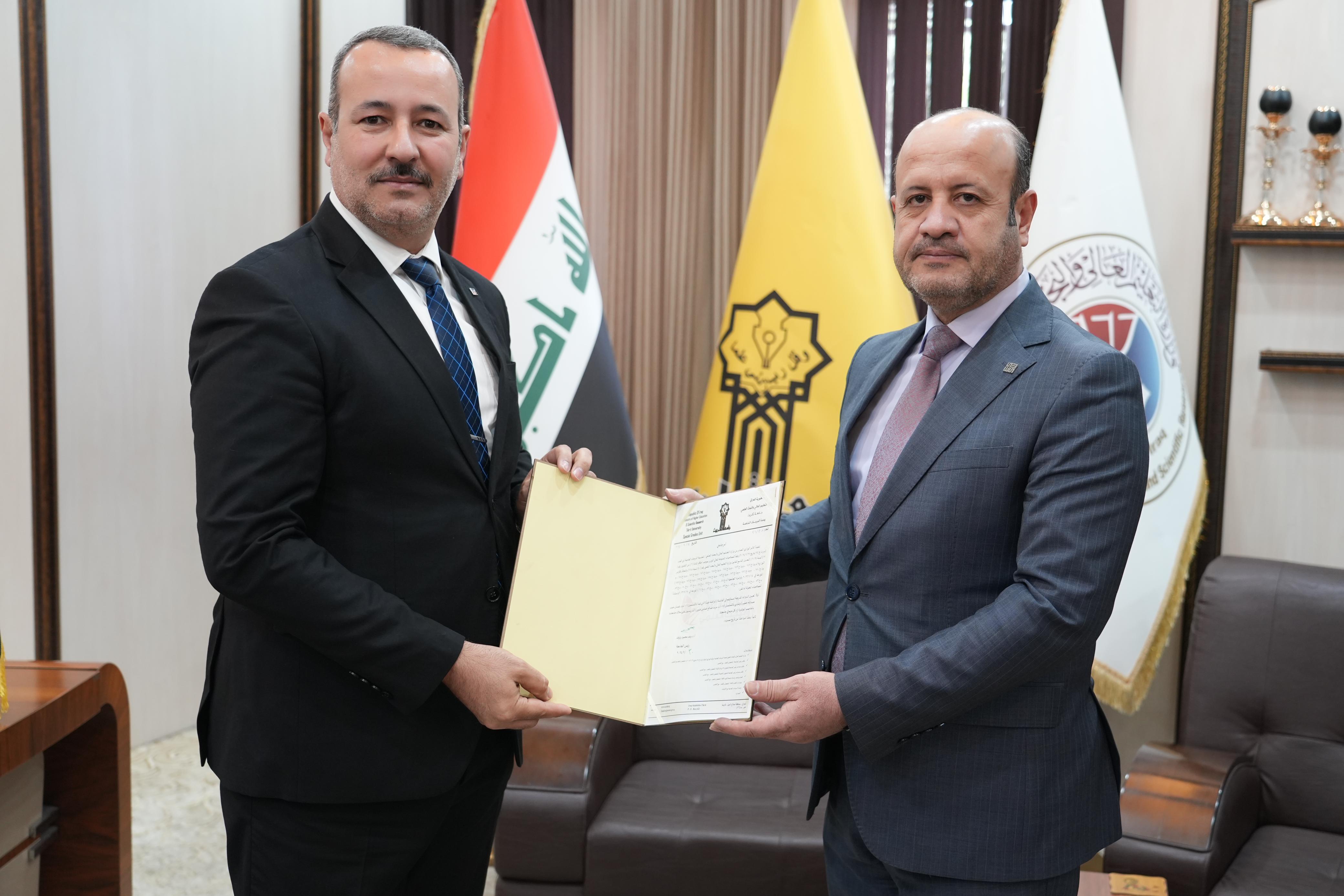 استقبل الاستاذ الدكتور وعد محمود رؤوف رئيس جامعة تكريت في مكتبه بحضور الاستاذ الدكتور حسين عبد اسماعيل مساعد رئيس الجامعة للشؤون الادارية السادة عمداء الكليات في الجامعة المثبتين بأمر وزاري وبعد الترحيب بهم بارك رئيس الجامعة للحاضرين تثبيتهم وقدم لهم تهانيه بصدور الامر الوزاري الخاص بقرار تثبيتهم عمداء على كلياتهم داعيا الى بذل مزيد من الجهد والتفاني والعطاء والاخلاص لخدمة الجامعة ومسيرة التعليم العالي العلمية والاكاديمية قام بعدها بتسليمهم الاوامر الوزارية الخاصة بتثبيتهم متمنيا لهم الموفقية والنجاح في مسيرتهم