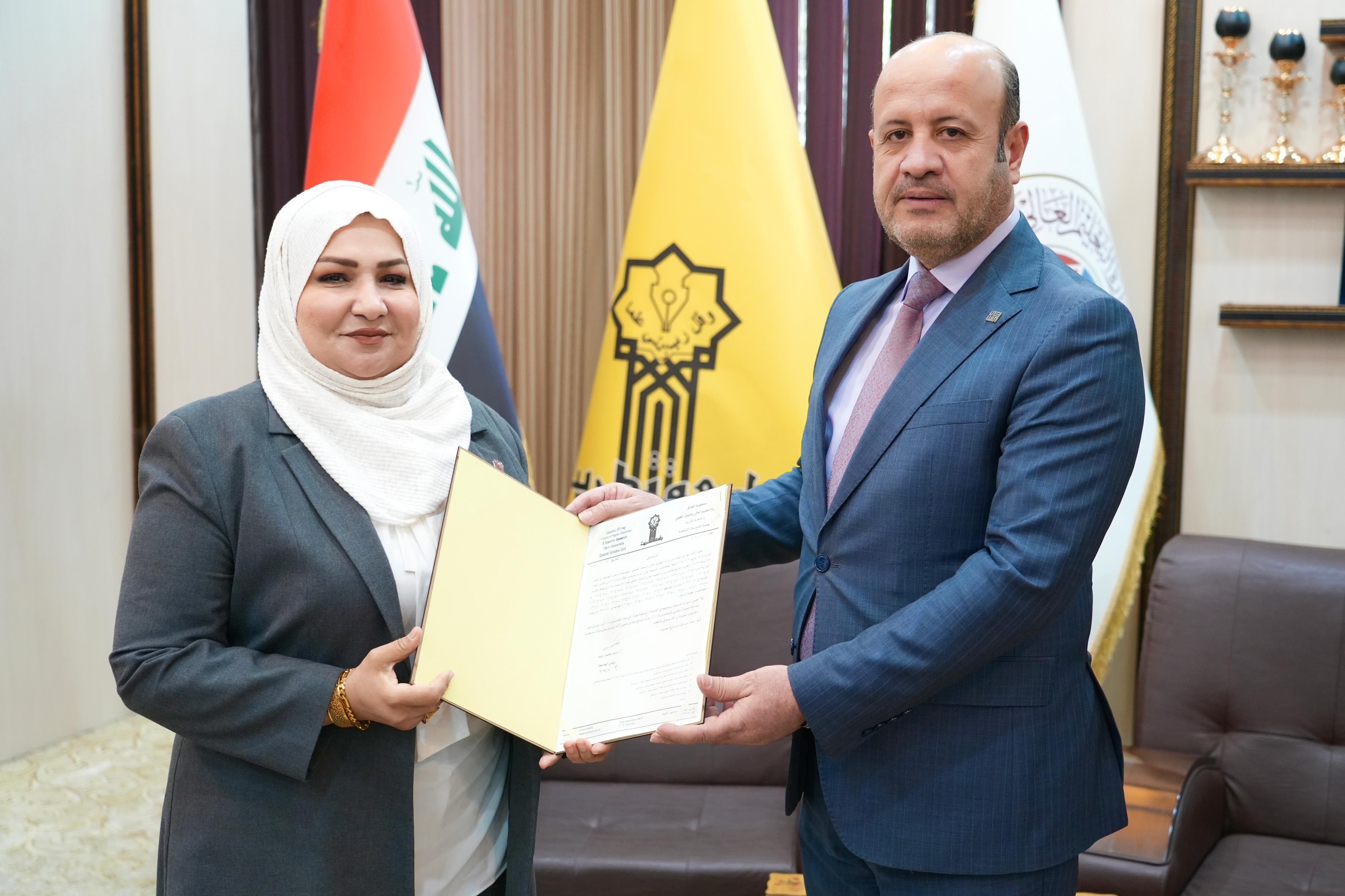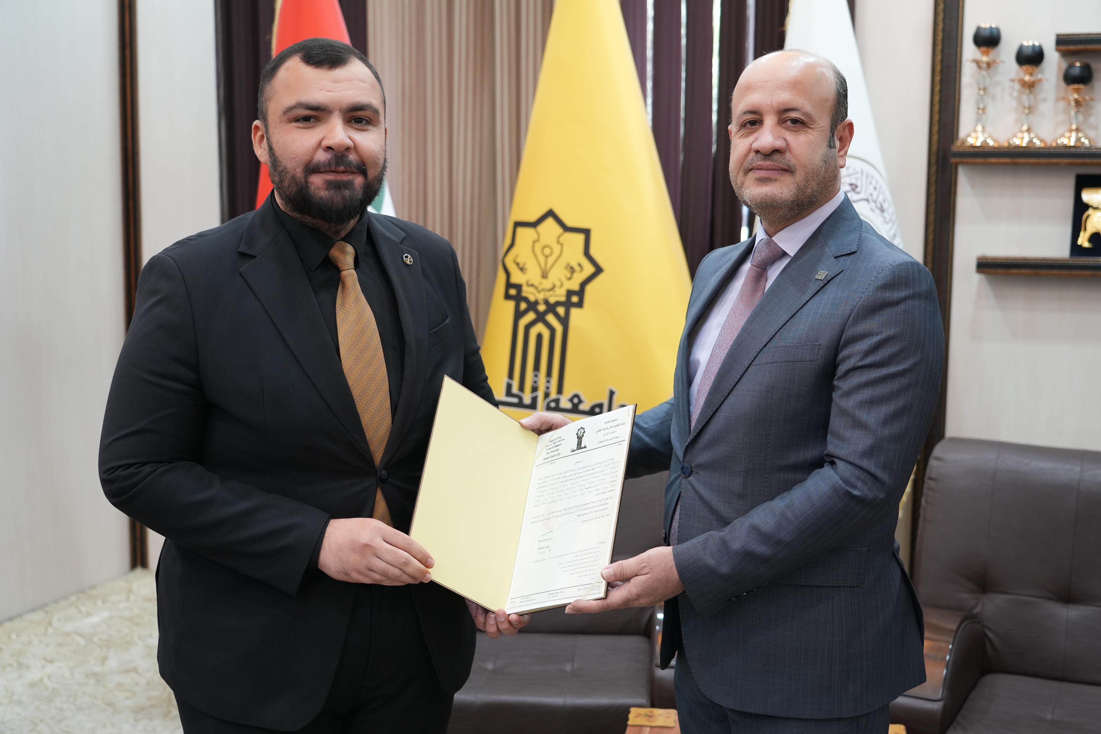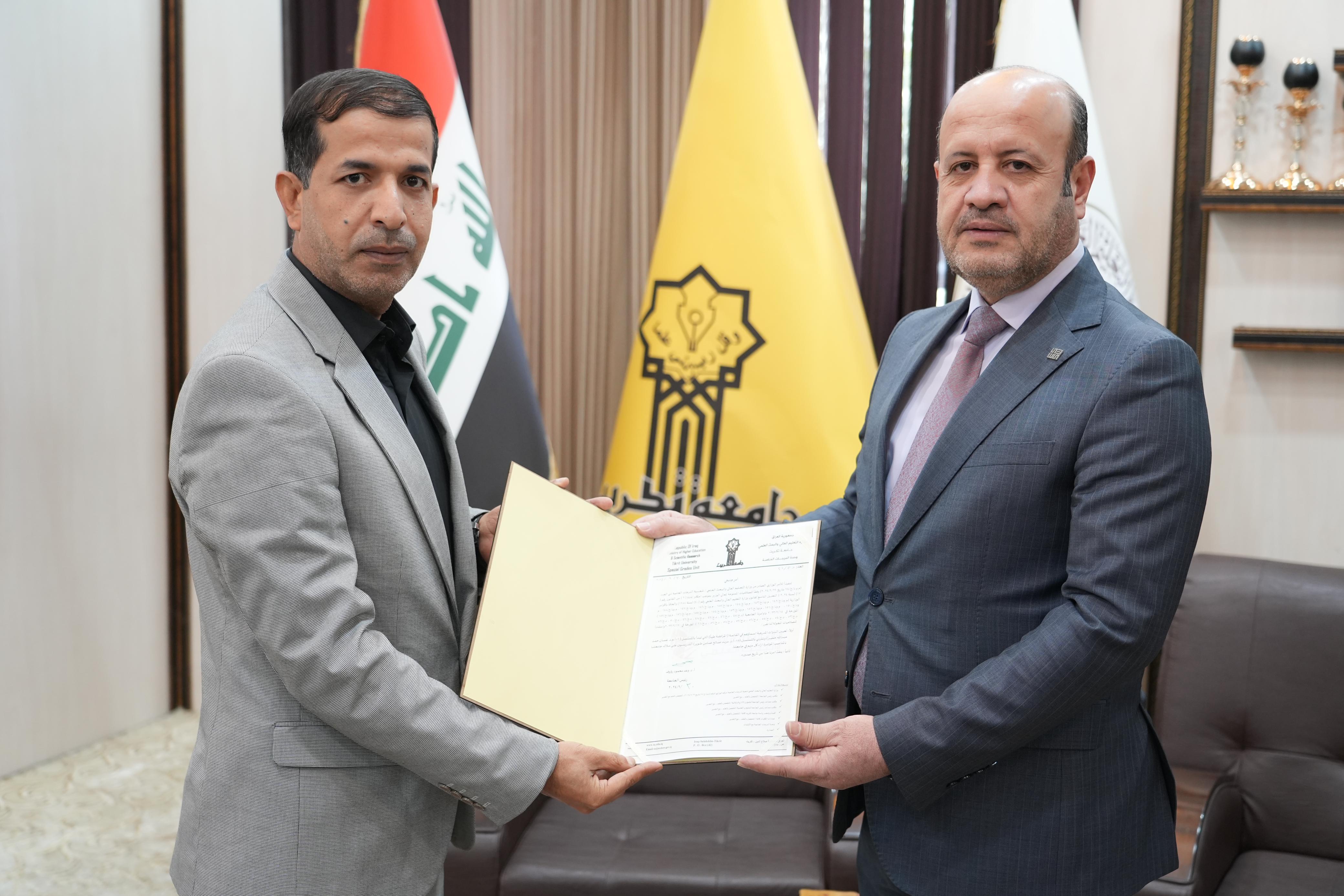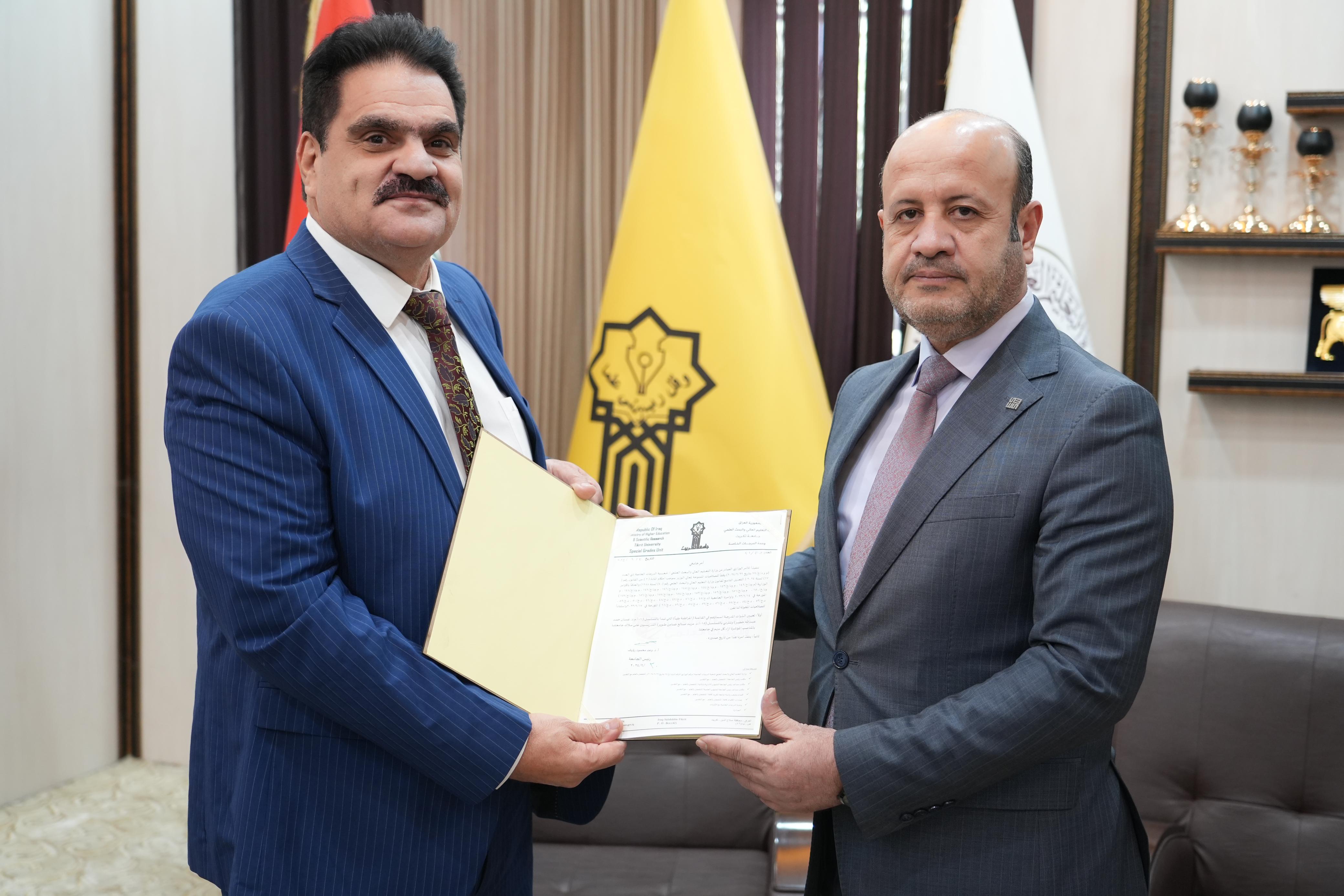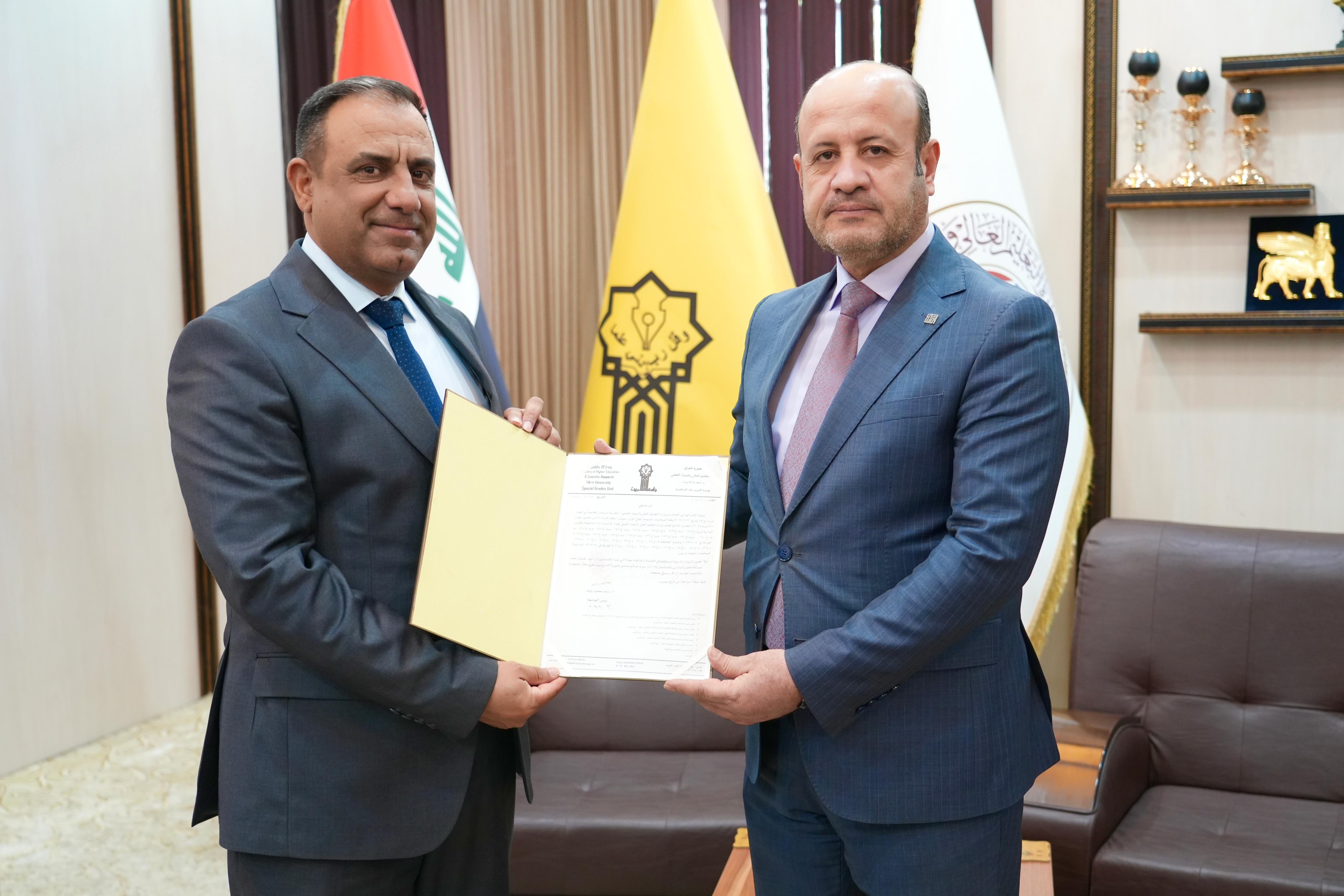 استقبل الاستاذ الدكتور وعد محمود رؤوف رئيس جامعة تكريت في مكتبه بحضور الاستاذ الدكتور حسين عبد اسماعيل مساعد رئيس الجامعة للشؤون الادارية السادة عمداء الكليات في الجامعة المثبتين بأمر وزاري وبعد الترحيب بهم بارك رئيس الجامعة للحاضرين تثبيتهم وقدم لهم تهانيه بصدور الامر الوزاري الخاص بقرار تثبيتهم عمداء على كلياتهم داعيا الى بذل مزيد من الجهد والتفاني والعطاء والاخلاص لخدمة الجامعة ومسيرة التعليم العالي العلمية والاكاديمية قام بعدها بتسليمهم الاوامر الوزارية الخاصة بتثبيتهم متمنيا لهم الموفقية والنجاح في مسيرتهم