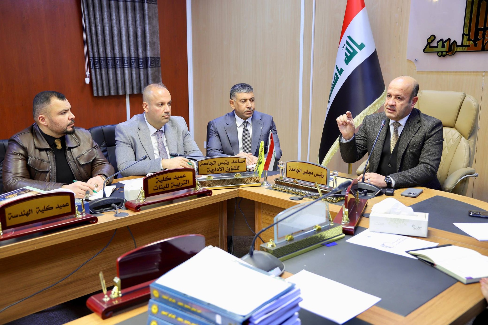 وجرى خلال الاجتماع مناقشة واقع الاعتماد المؤسسي في الجامعة، ومتابعة متطلبات ومعايير الاعتماد المعتمدة من قبل وزارة التعليم العالي والبحث العلمي، فضلاً عن استعراض مراحل التقدم المحرز في هذا الملف المهم، وآليات تعزيز الأداء المؤسسي والحوكمة الأكاديمية بما ينسجم مع معايير الجودة الشاملة.