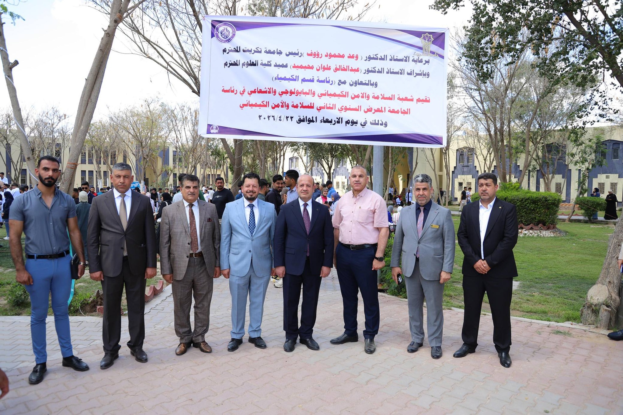 افتتح السيد رئيس جامعة تكريت، الأستاذ الدكتور وعد محمود رؤوف، فعاليات المعرض السنوي الثاني للسلامة والأمن الكيميائي، الذي نظمته شعبة السلامة والأمن الكيميائي والبايولوجي والإشعاعي في رئاسة الجامعة بالتعاون مع كلية العلوم/قسم الكيمياء، في خطوة تعكس اهتمام المؤسسة الأكاديمية بترسيخ ثقافة السلامة داخل بيئتها التعليمية والبحثية.