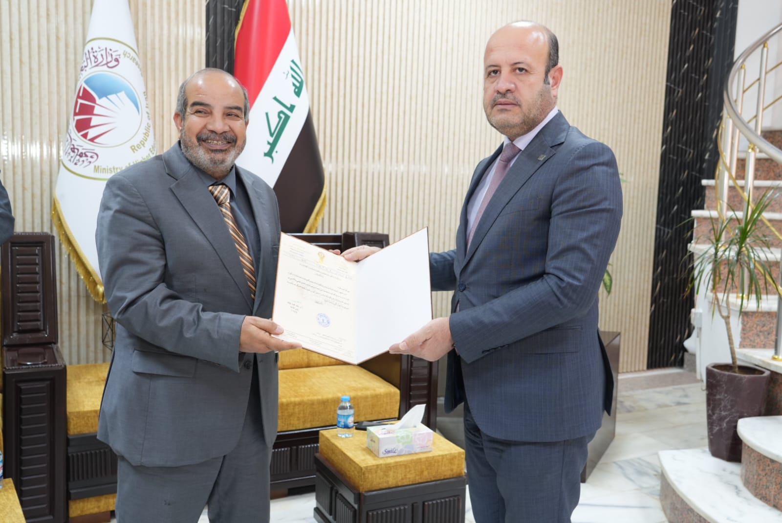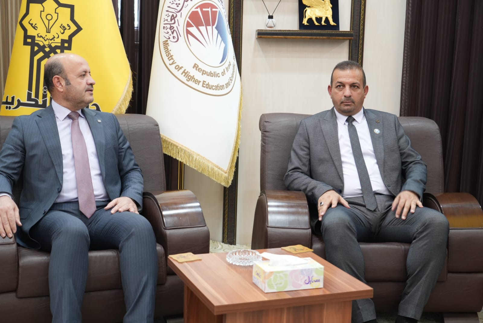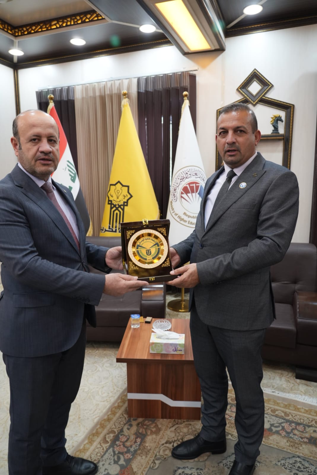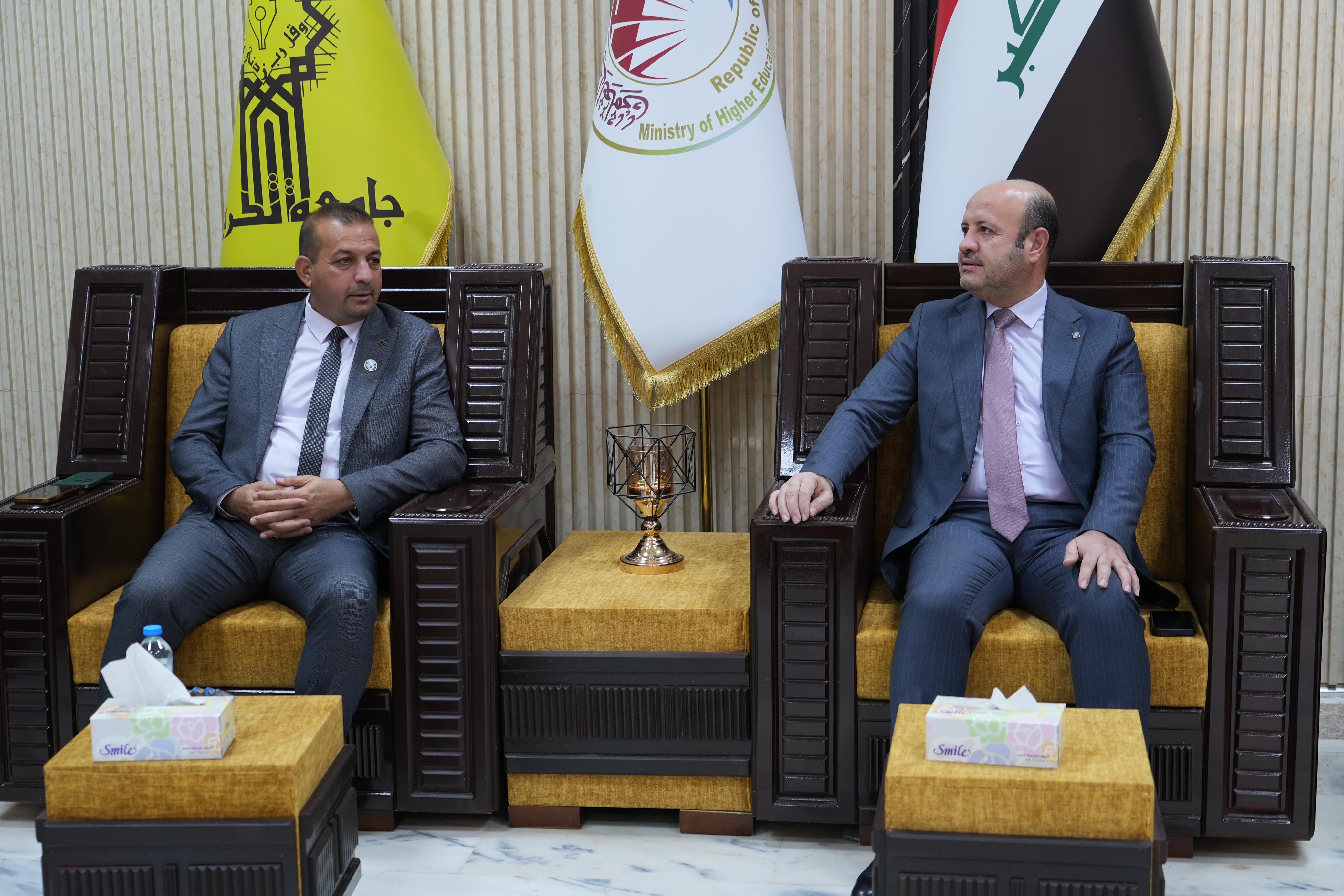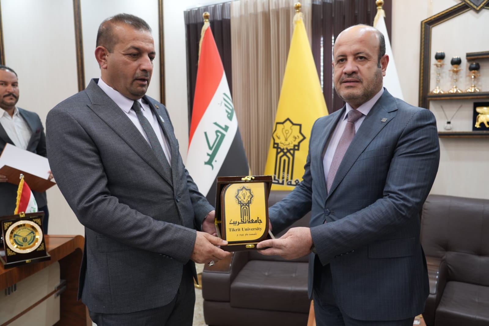 وفي سياق متصل استقبل الاستاذ الدكتور وعد محمود رئيس جامعة تكريت في مكتبه الاستاذ الدكتور وضاح عامر حاتم رئيس الجامعة التقنية الوسطى والذي شارك بصفته عضوا ومشرفا في مناقشة اطروحة الدكتوراه بكلية الهندسة حيث تم تكريمه بكتاب شكر وتقدير لجهوده المبذولة في هذه اللجنة وتجشمه عناء السفر، وتكريم وعدد من السادة المناقشين.