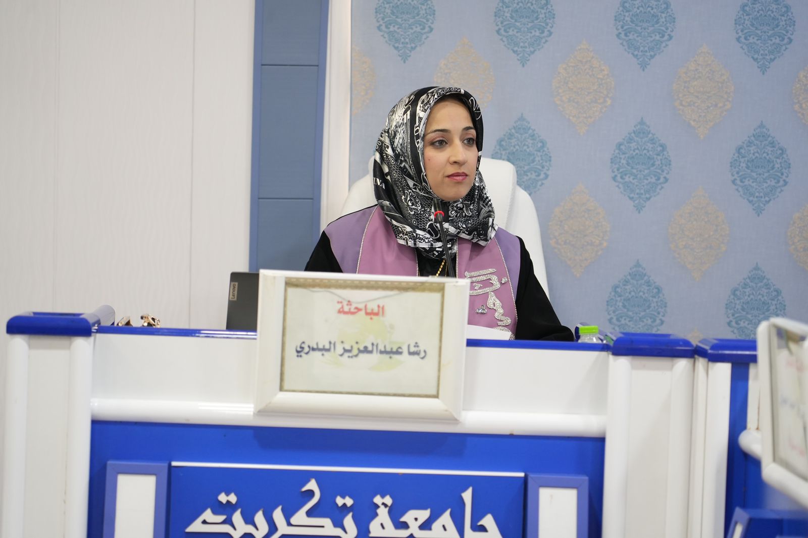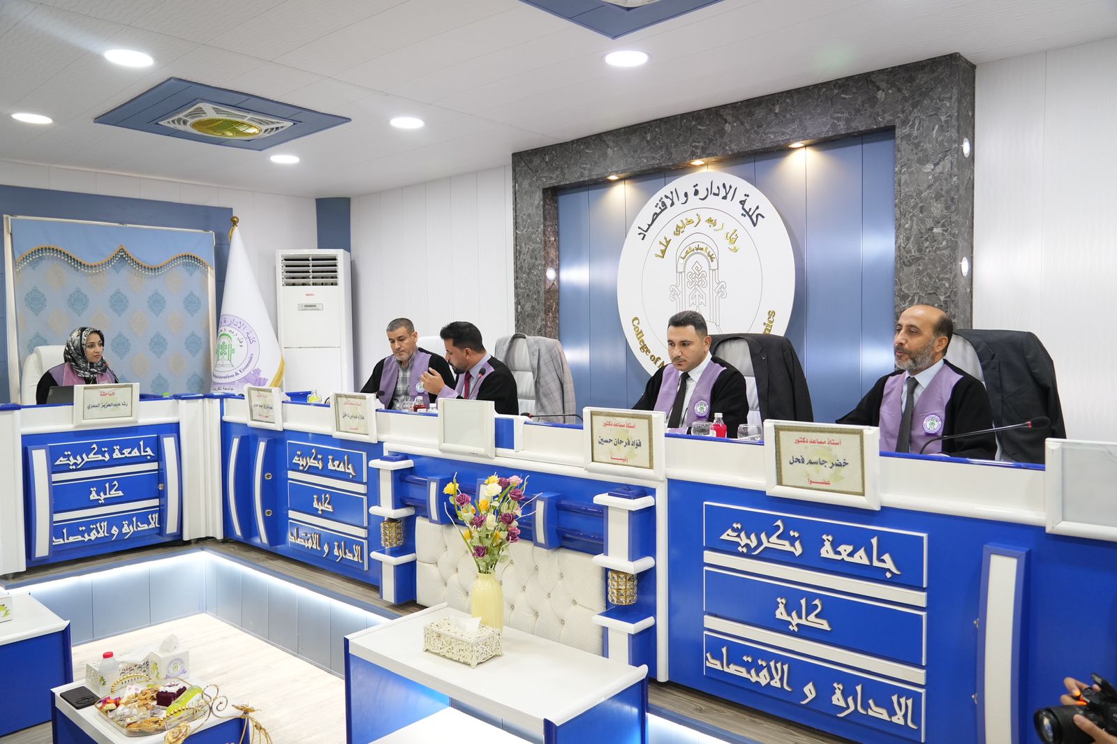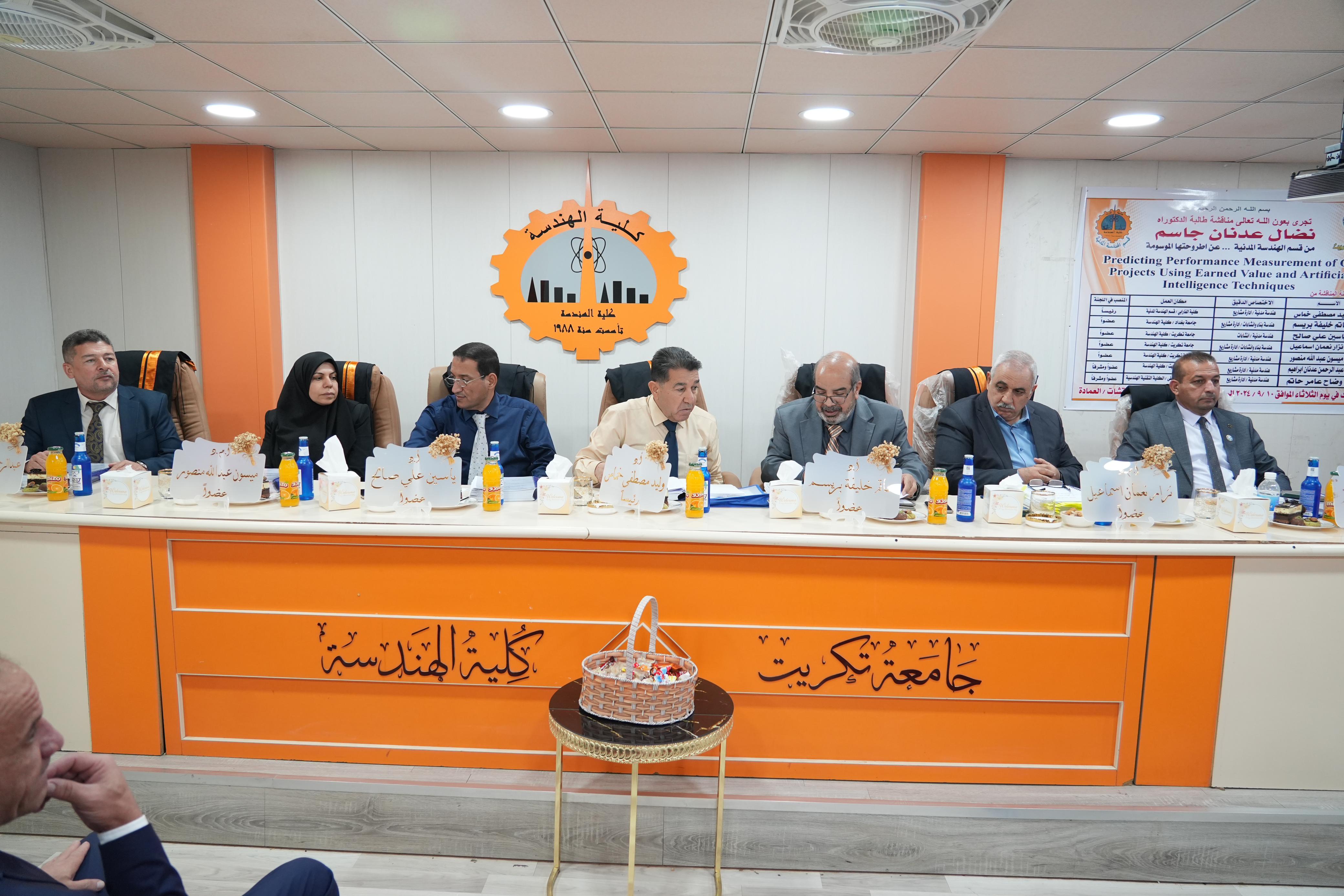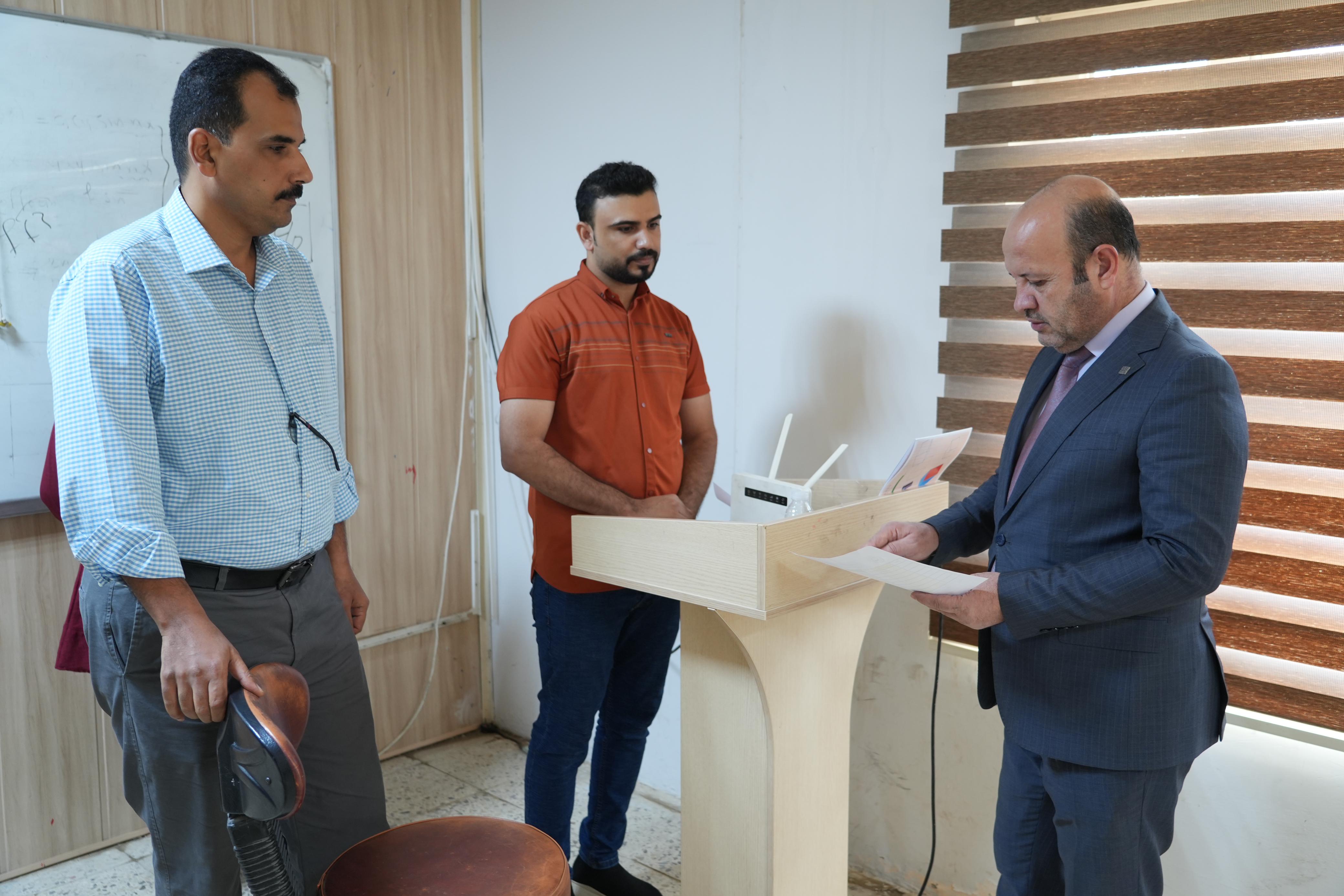 ضمن النهج المستمر لرئيس الجامعة في المشاركة وحضوره الشخصي والفاعل في مناقشات الرسائل والاطاريح العلمية حضر الاستاذ الدكتور وعد محمود رؤوف رئيس جامعة تكريت مناقشتين الاولى اطروحة دكتوراه بكلية الهندسة للطالبة (نضال عدنان جاسم) والثانية مناقشة رسالة ماجستير بكلية الادارة والاقتصاد للطالبة (رشا عبدالعزيز البدري)