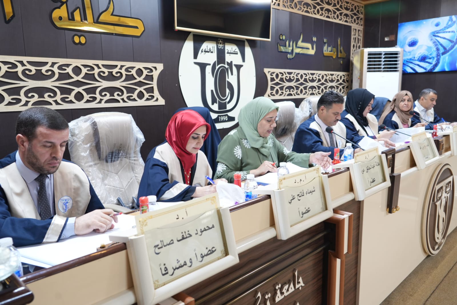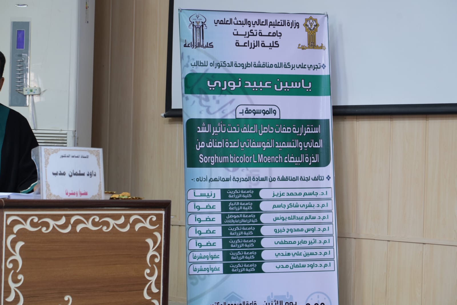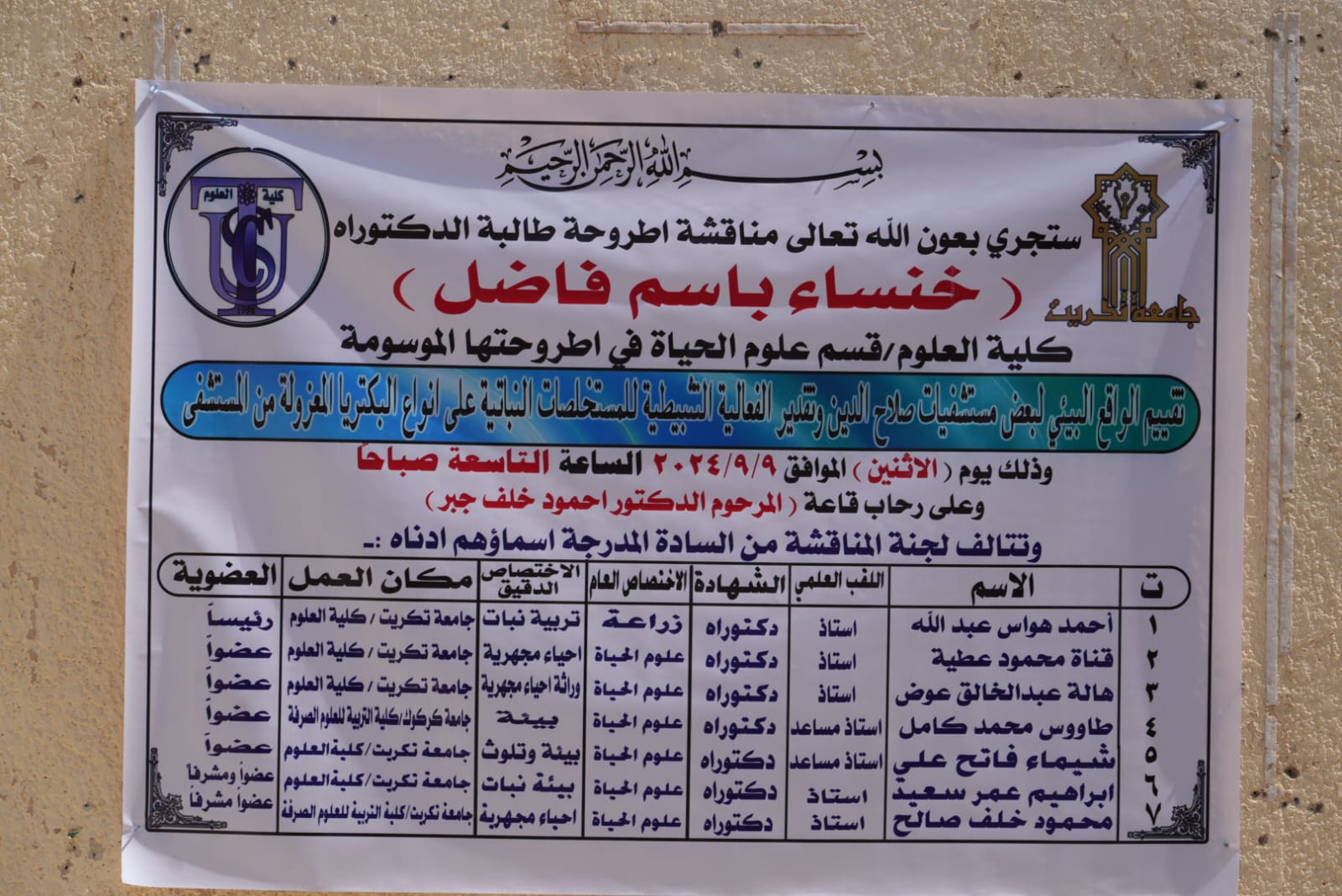في اطار النهج المستمر والدائم في الحضور الشخصي والفاعل لرئيس الجامعة للمناقشات العلمية لإطاريح الدكتوراه ورسائل الماجستير حضر الاستاذ الدكتور وعد محمود رؤوف رئيس جامعة تكريت مناقشة اطروحتي دكتوراه الاولى للطالبة (خنساء باسم فاضل ) من كلية العلوم قسم علوم الحياة في اطروحتها الموسومة (الواقع البيئي لبعض مستشفيات صلاح الدين وتنير العالي التثبيطية للمستخصات النباتية على انواع البكتريا العمولة من المستشفى) على رحاب قاعة المرحوم الدكتور احمود خلف جبر