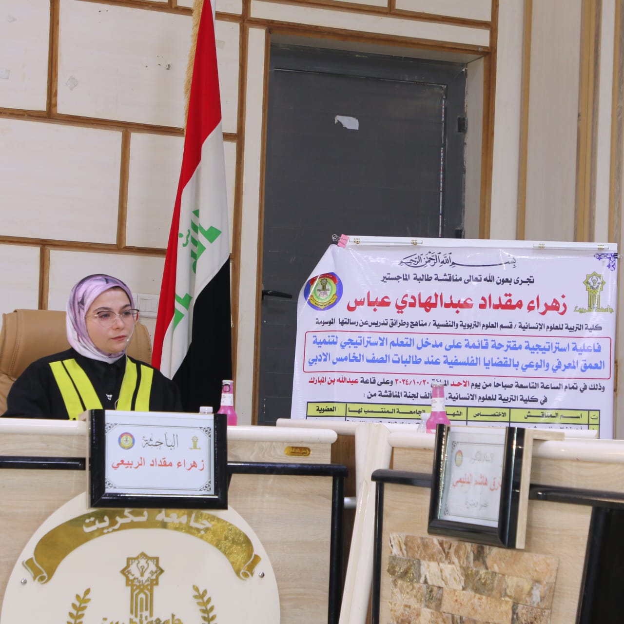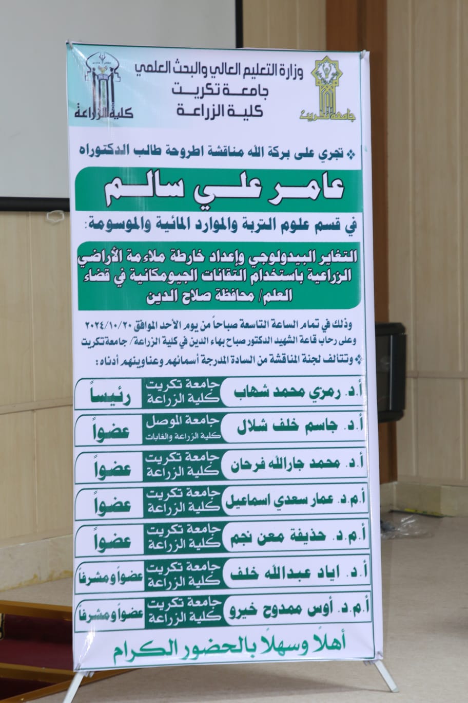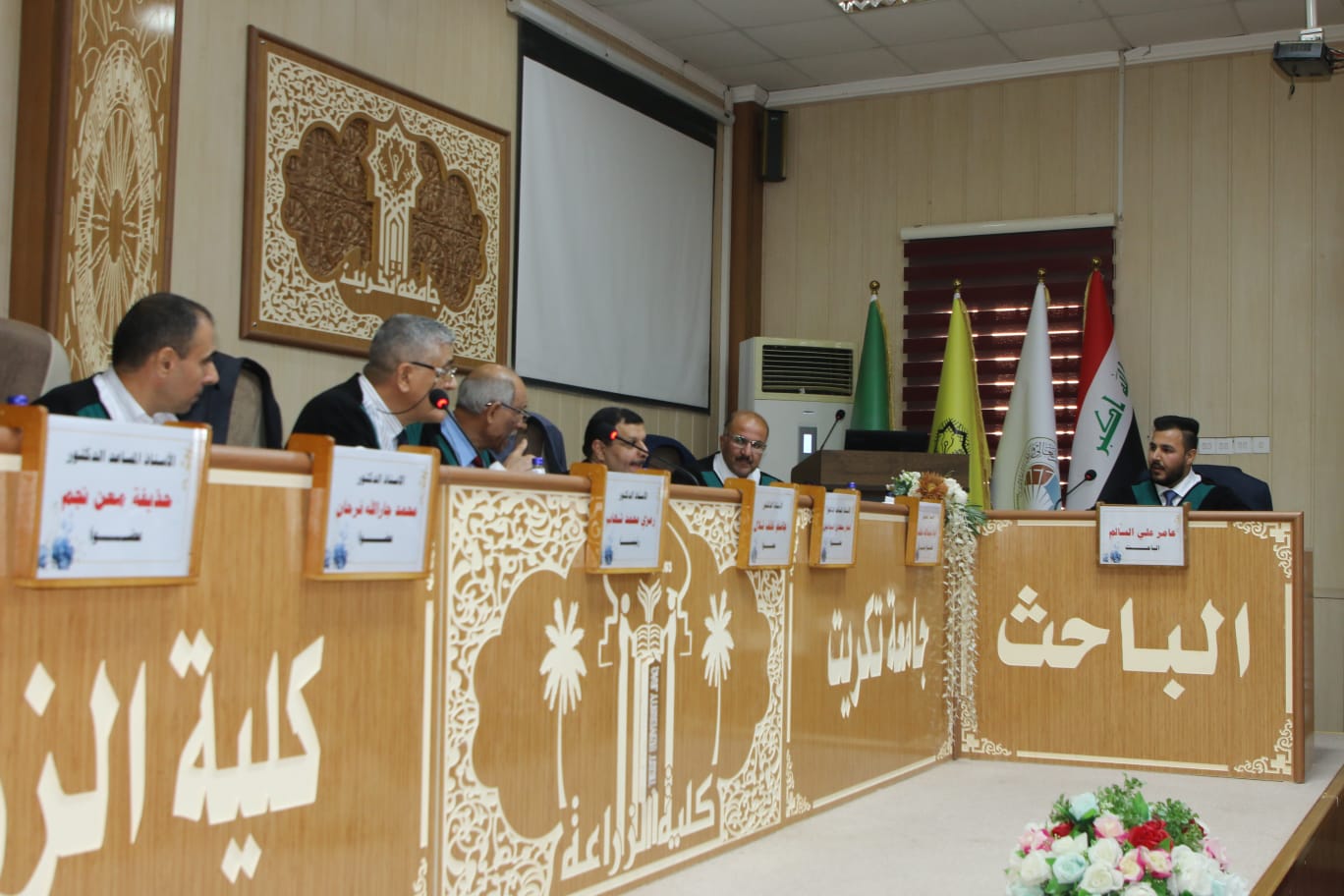 ضمن النهج المستمر لرئيس الجامعة في المشاركة وحضوره الشخصي والفاعل في مناقشات الرسائل والاطاريح العلمية بالجامعة حضر الاستاذ الدكتور وعد محمود رؤوف رئيس جامعة تكريت مناقشة طالب الدكتوراه عامر علي سالم في كلية الزراعة عن اطروحته الموسومة (التغاير البيدولوجي واعداد خارطة ملاءمة الاراضي الزراعية بأستخدام التقانات الجيومكانية في قضاء العلم/ محافظة صلاح الدين) احتضنتها قاعة المرحوم الدكتور ( صباح بهاء الدين) بالكلية ومناقشة طالبة الماجستير زهراء عبدالهادي عباس في كلية الترية للعلوم الانسانية/ قسم العلوم التربوية والنفسية/ مناهج وطرائق تدريس عن رسالتها الموسومة (فاعلية استراتيجية مقترحة قائمة على مدخل التعلم الاستراتيجي لتنمية العمق المعرفي والوعي بالقضايا الفلسفية عند طالبات الصف الخامس الادبي) على قاعة عبدالله بن المبارك بالكلية