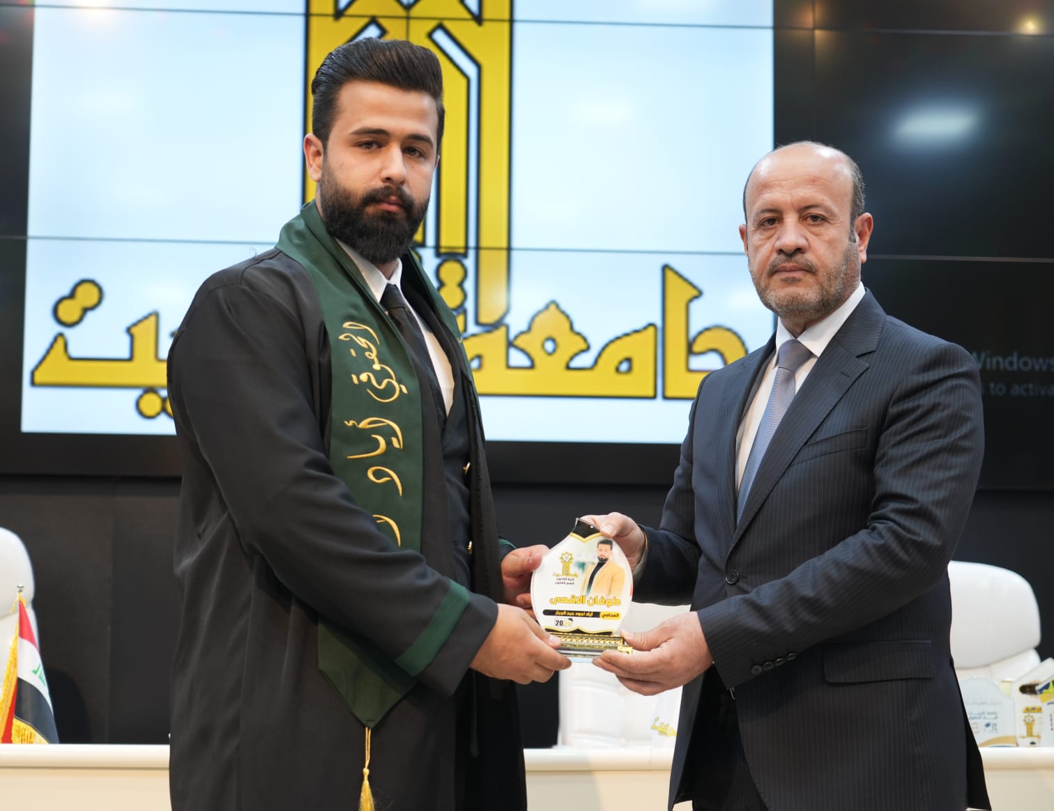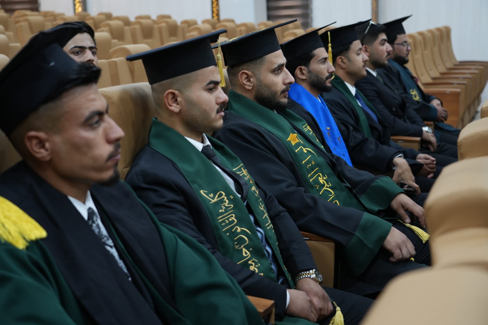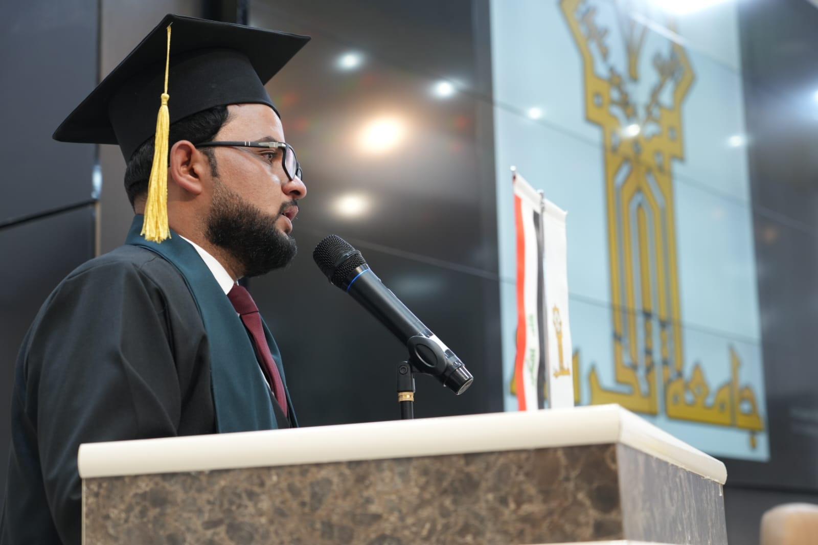 ثم القى ممثل الطلبة كلمة الطلبة الخريجيين والتي اثنى فيها على جهود الكلية والجامعة والاساتذة وماقدموه من الدعم الكامل والذي بدوره أدى الى خلق جيل مثقف وقادرٍ على حمل الرسالة وتحقيق غايتها في خدمة المجتمع.