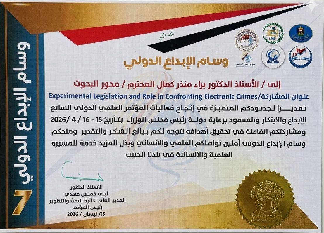 ويعكس هذا الإنجاز تميز الكوادر التدريسية في كلية القانون بجامعة تكريت، ودورها الفاعل في إثراء البحث العلمي ومواكبة القضايا القانونية الحديثة على المستويين المحلي والدولي.
