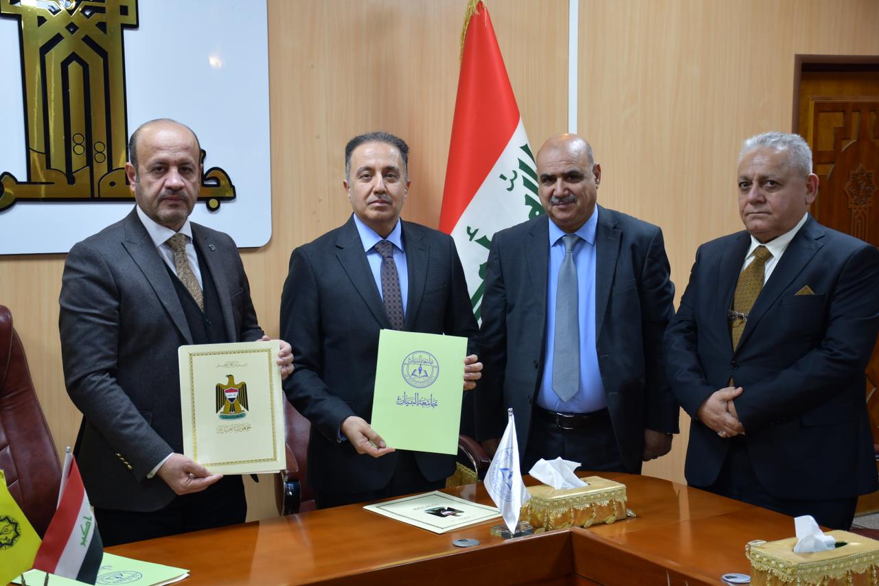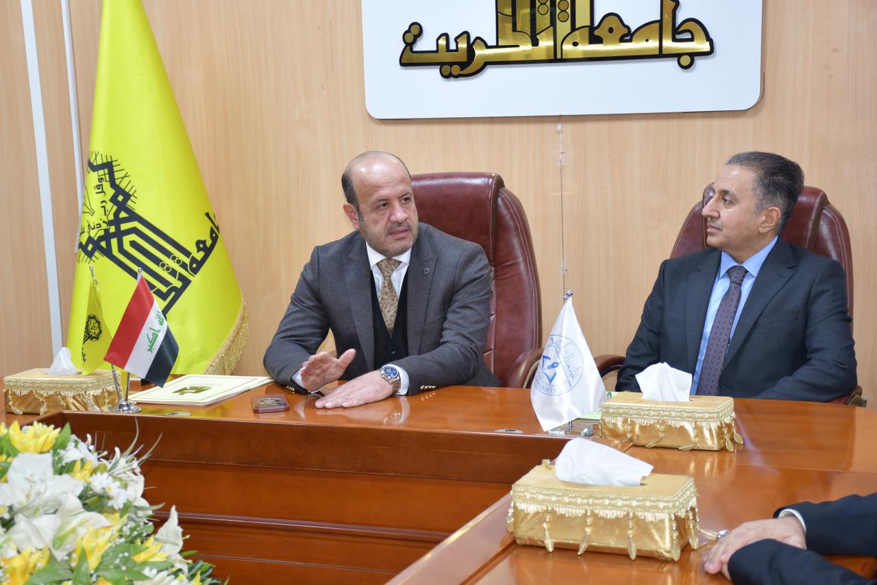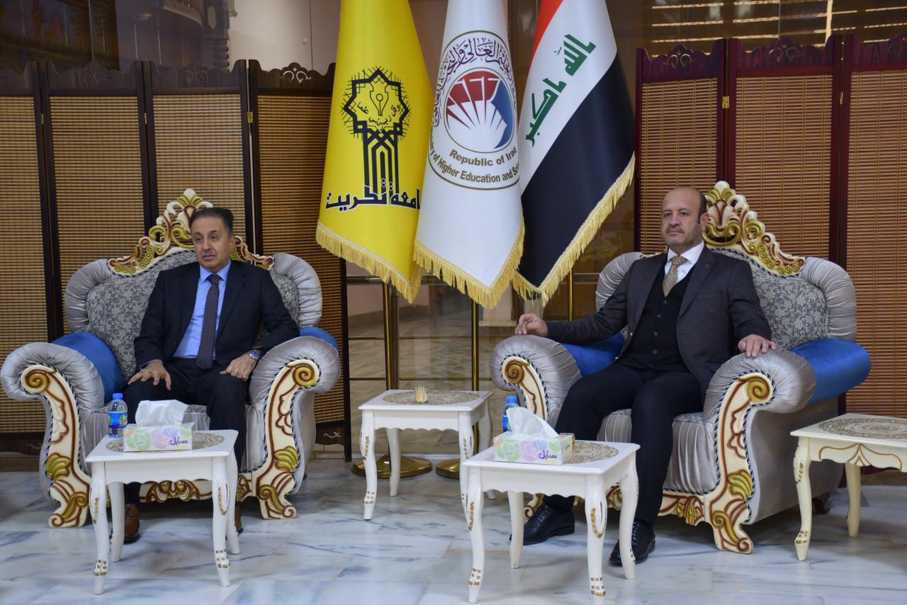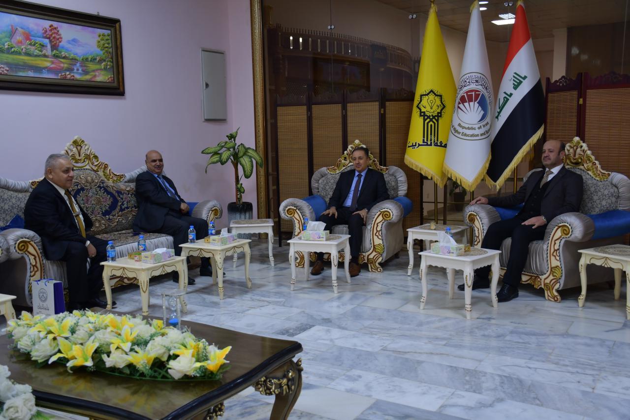 تثبيتا لنهجها في فتح افاق التعاون العلمي والاكاديمي المشترك مع الجامعات والمؤسسات العلمية والاكاديمية والمؤسسات والدوائر الحكومية بما يخدم ويحقق المصلحة العامة استقبل الاستاذ الدكتور وعد محمود رؤوف رئيس جامعة تكريت في مكتبه الاستاذ الدكتور حيدر طالب الامارة رئيس جامعة البيان يرافقه الاستاذ المساعد الدكتور عبدالجبار حسين علي مساعد رئيس جامعة البيان للشؤون العلمية والاستاذ المساعد الدكتور ثائر عبدالوهاب رئيس قسم العلاقات الثقافية في جامعة البيان.