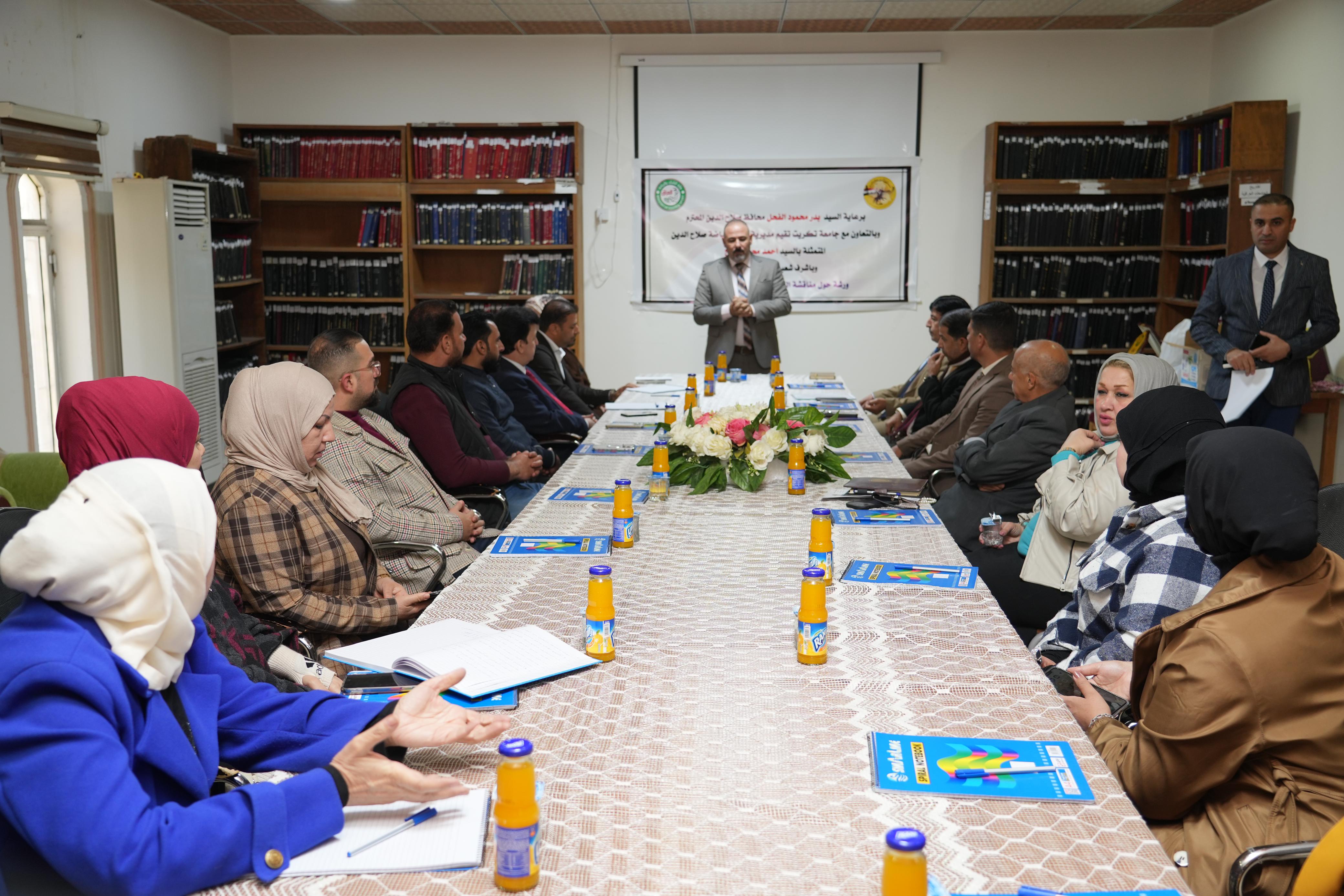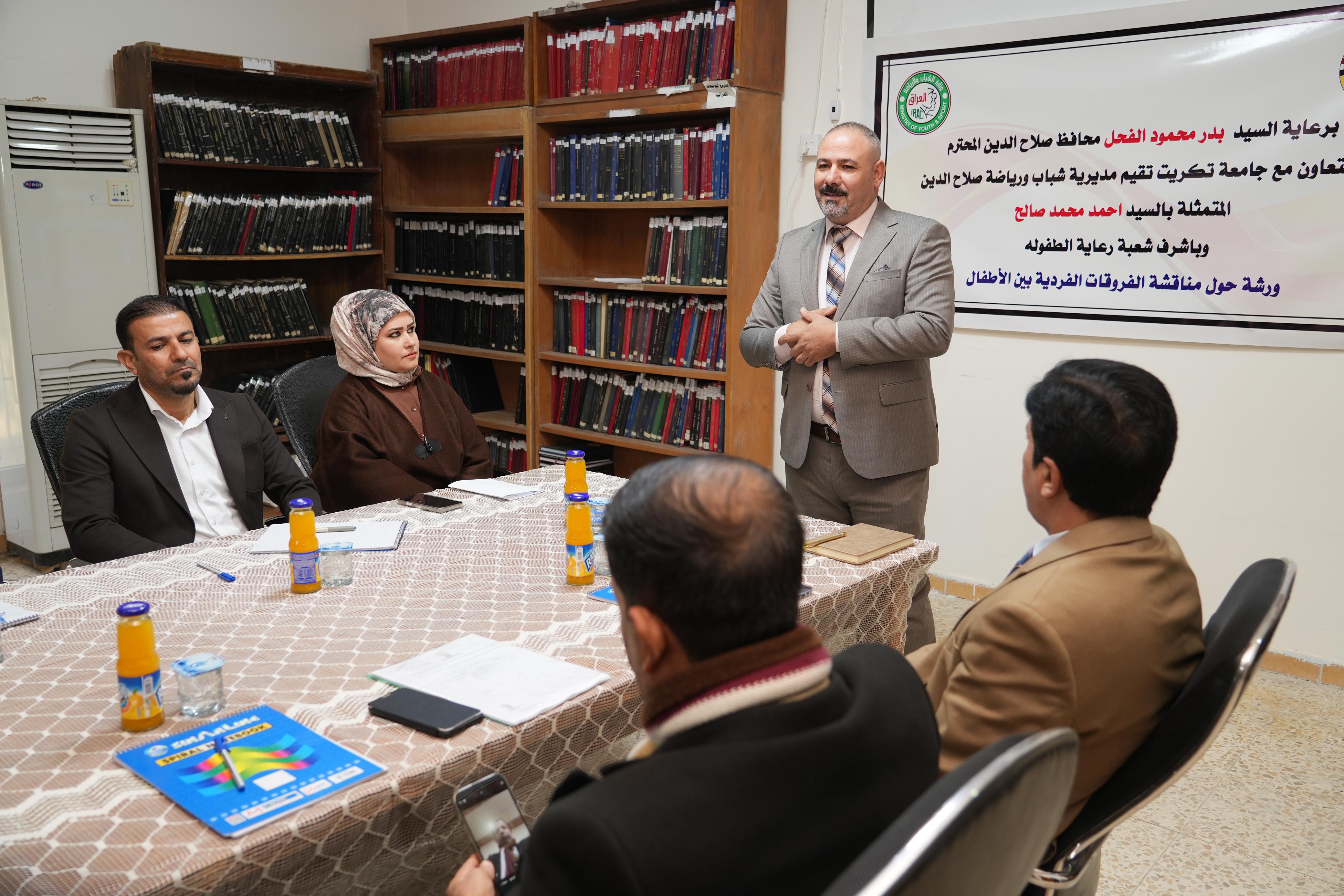 اقيمت وعلى قاعة المكتبة المركزية بجامعة تكريت ورشة عمل بعنوان "مناقشة الفروقات الفردية بين الأفراد". نظمت الورشة مديرية شباب ورياضة صلاح الدين، وبإشراف شعبة رعاية الطفولة بالتعاون مع جامعة تكريت، بحضور السيد أحمد محمد صالح مدير الشباب والرياضة في المحافظة والاستاذ الدكتور انور فارس عبد عميد كلية العلوم الاسلامية والاستاذ المساعد الدكتور عبدالله محمد طياوي عميد كلية التربية البدنية وعلوم الرياضة و عدد من الأكاديميين ذوي الاختصاص.